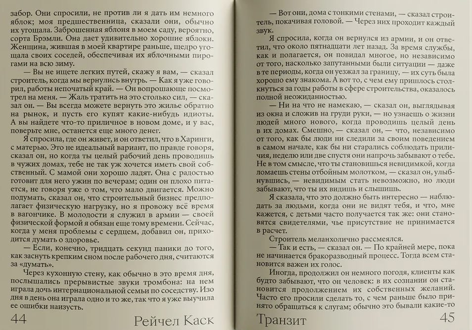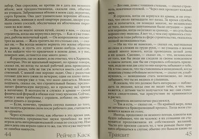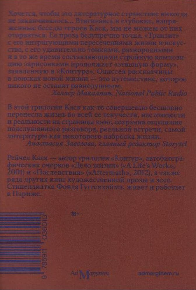 В романе «Транзит» Рейчел Каск глубже погружается в темы, впервые затронутые в снискавшем признание «Контуре», и предлагает читателю глубокие и трогательные размышления о детстве и судьбе, ценности страдания, моральных проблемах личной ответственности и тайне перемен. Во второй книге своей лаконичной и вместе с тем эпической трилогии Каск описывает глубокие жизненные переживания, трудности на пороге серьезных изменений. Она с тревожащей сдержанностью и честностью улавливает стремление одновременно жить и бежать от жизни, а также мучительную двойственность, пробуждающую наше желание чувствовать себя реальными.
