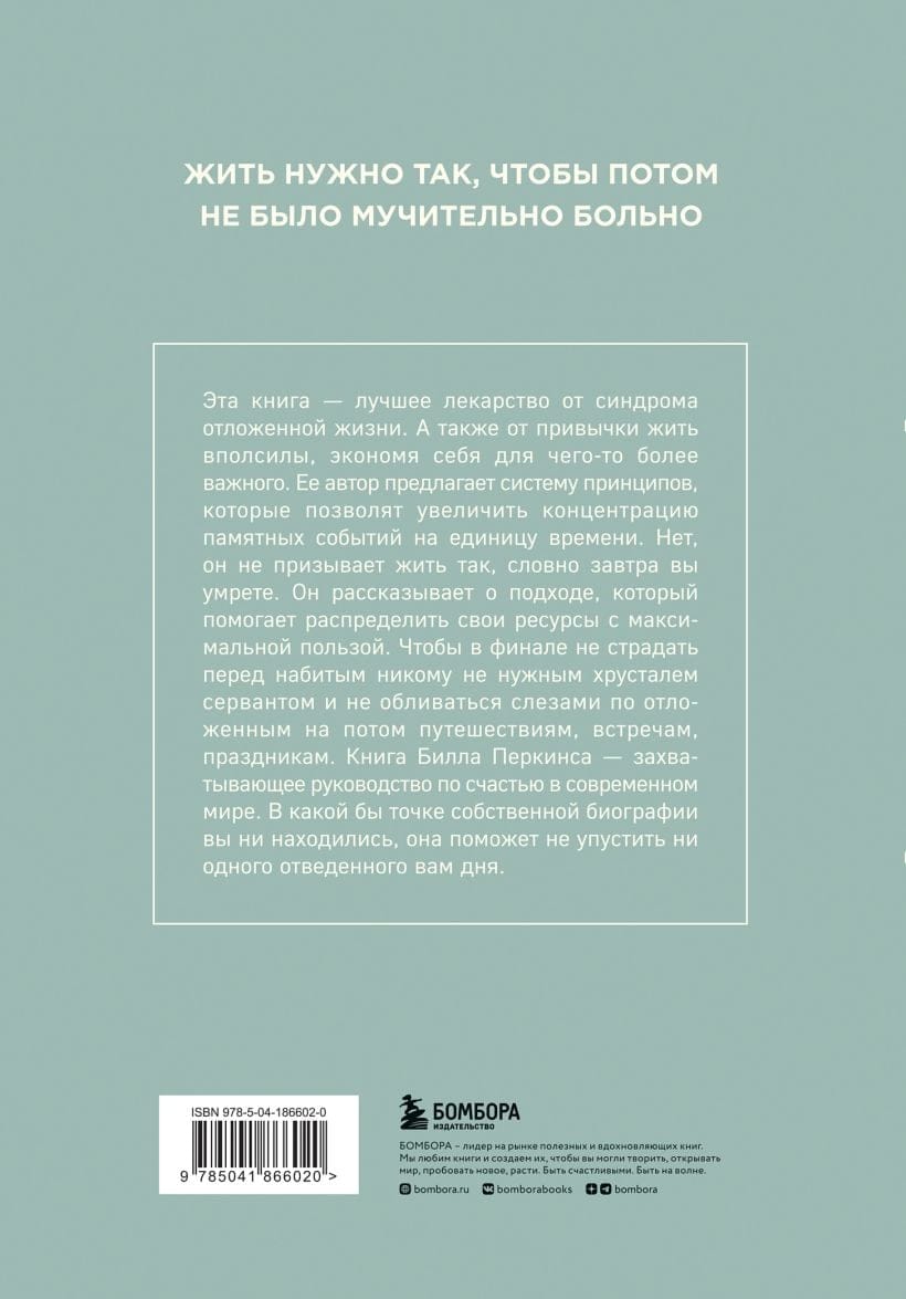 Эта книга — лучшее лекарство от синдрома отложенной жизни. А также от привычки жить вполсилы, экономя себя для чего-то более важного. Ее автор предлагает систему принципов, которые позволят увеличить концентрацию памятных событий на единицу времени. Нет, он не призывает жить так, словно завтра вы умрете. Он рассказывает о подходе, который помогает распределить свои ресурсы с максимальной пользой. Чтобы в финале не страдать перед набитым никому не нужным хрусталем сервантом и не обливаться слезами по отложенным на потом путешествиям, встречам, праздникам. Книга Билла Перкинса — захватывающее руководство по счастью в современном мире. В какой бы точке собственной биографии вы ни находились, она поможет не упустить ни одного отведенного вам дня.