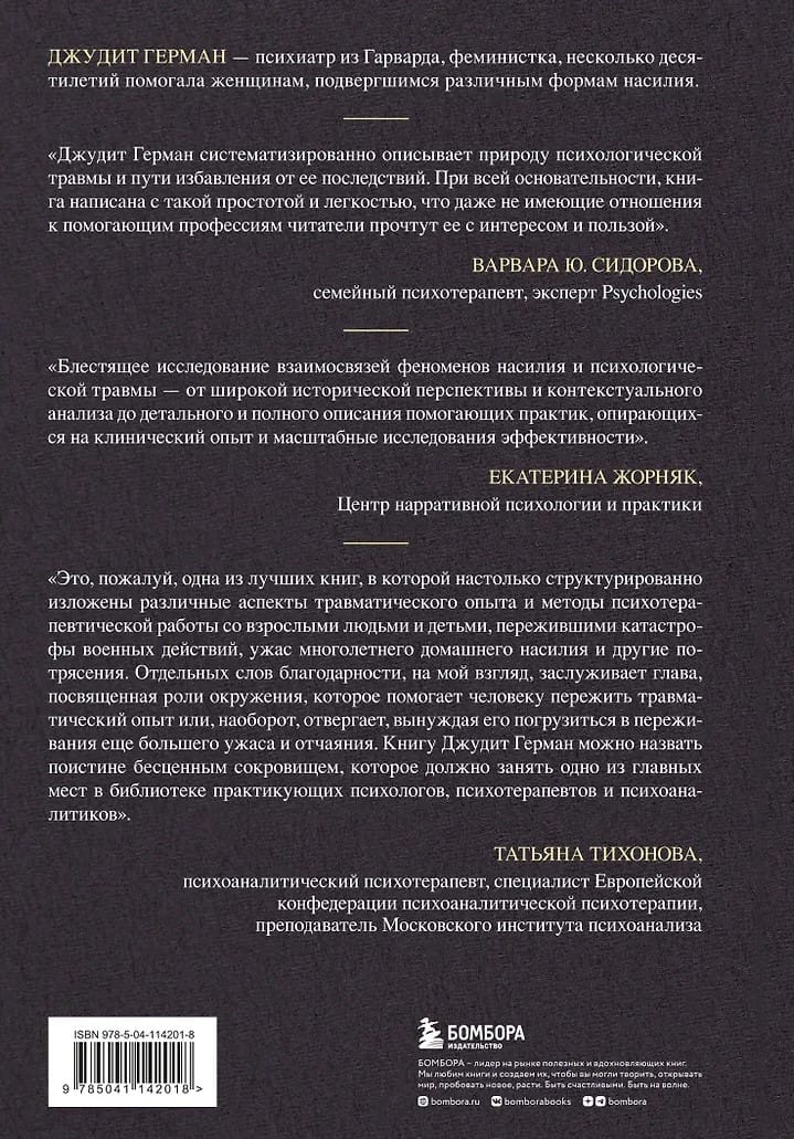 Джудит Герман — психиатр из Гарварда, феминистка, несколько десятилетий помогала женщинам, пережившим сексуальное насилие, включая насилие в детском возрасте и домашние насилие. Автор утверждает, что психологическая травма неотделима от ее социального и политического контекста. Опираясь на свое собственное исследование случаев насилия над детьми, а также обширную литературу о ветеранах боевых действий и жертвах политического террора, она показывает параллели между частными ужасами, домашним насилием и общественными ужасами, войной.