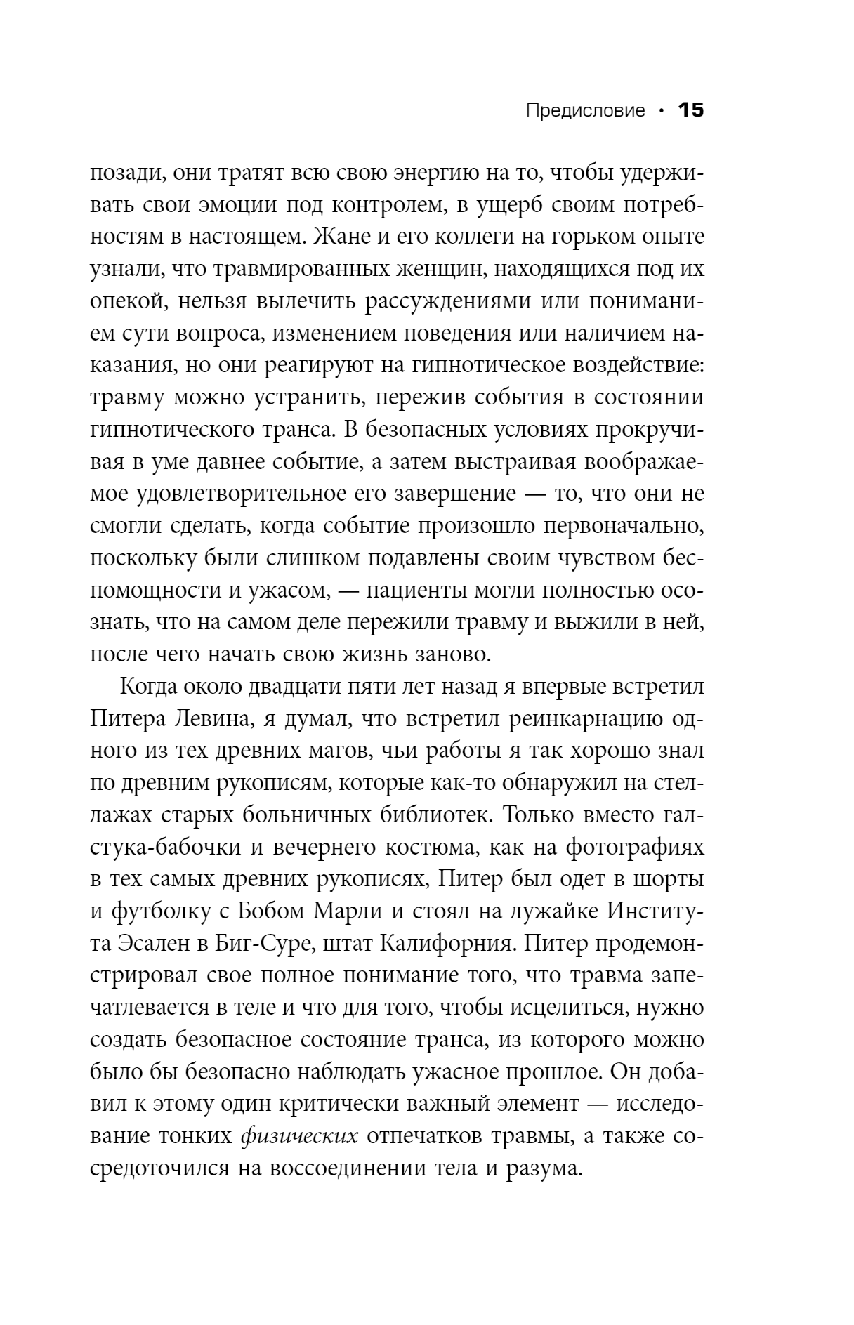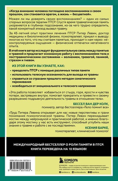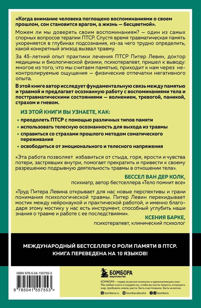 Питер Левин, доктор наук и психотерапевт, долгое время наблюдал за тем, как воспоминания позволяют травматическим событиям влиять на наши мысли, чувства и действия. В своей книге автор доказывает — травма и память связаны, и понимание того, как работает это взаимодействие, имеет основополагающее значение для лечения травм.