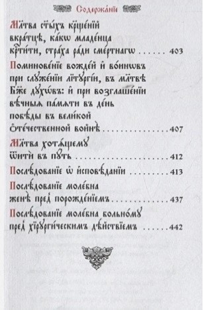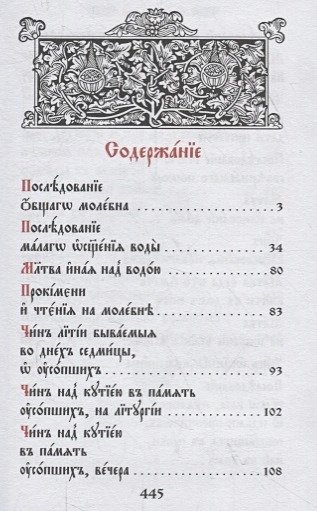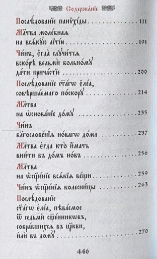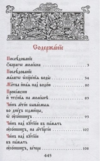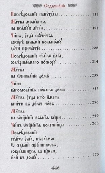 В издание включены последования общего молебна, малого освящения воды, святого елея, о исповедании, молебнов жене перед порождением и больному перед хирургическим действием, чинопоследования о усопших, чины и молитвы прочих освящений и благословений.