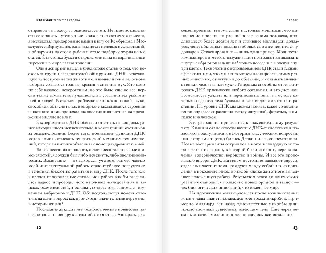 «Требуется сборка. Расшифровываем четыре миллиарда лет истории жизни – от древних окаменелостей до ДНК» – увлекательное путешествие в мир эволюционных и генетических исследований. Нил Шубин разворачивает перед нами панораму ученых-энтузиастов, решивших разгадать разнообразие форм жизни на нашей планете. Мы становимся соучастниками их открытий и научных диспутов, результатами которых являются потрясающие научные перевороты, от находки археоптерикса до расшифровки генома. Сперва ученые отправлялись в экспедиции, порой опасные для жизни, чтобы найти недостающие звенья эволюции, которые объяснили бы выход рыб на сушу. Теперь же генетики, не покидая лаборатории, могут манипулировать частями ДНК, искусственно воспроизводя принципы работы эволюционного развития. Подобные достижения – результаты работы множества людей, и Нил Шубин рассказывает их истории живо и захватывающе, заражая и читателя жаждой новых открытий.