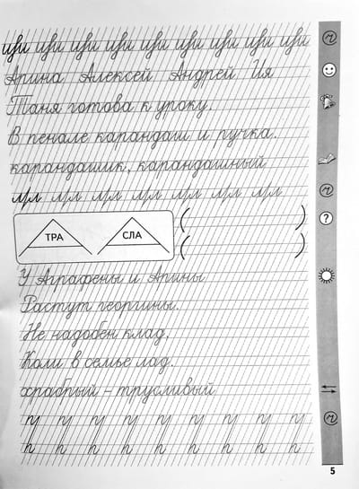 Пособие предназначено для комплексного развития многих практических навыков и умений ученика начальной школы, а учебные материалы соответствуют федеральному государственному образовательному стандарту. В то же время у нашего тренажёра есть ряд отличительных черт. Например, специфической особенностью пособия является помощь в переходе с одной разлиновки тетради на другую, а также страница-образец старых советских прописей.