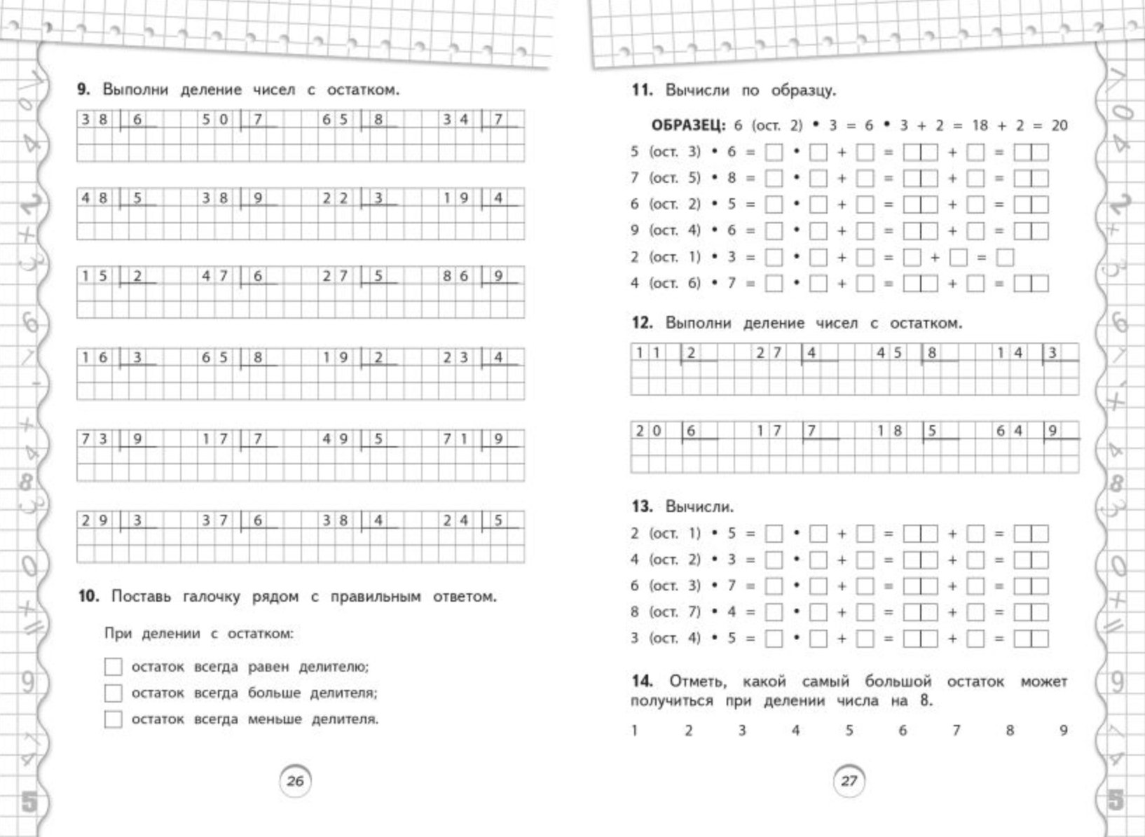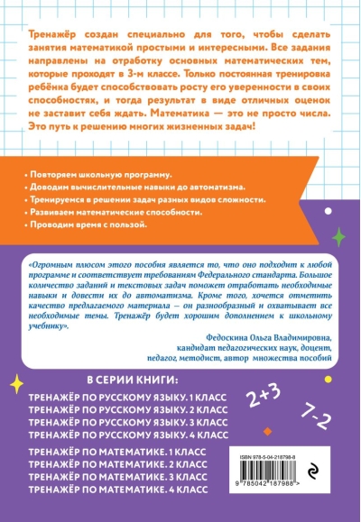 Пособие от издательства «Эксмо», соответствующее ФГОС, разработано специалистом с многолетним опытом работы и станет отличным помощником для учеников 3 класса в отработке умений и навыков, полученных на уроках математики. Решение большого количества примеров и задач на сложение и вычитание в пределах 1000, умножение и деление, деление с остатком, знакомство с долями даст возможность школьникам в дальнейшем избежать вычислительных ошибок и довести навыки счёта до автоматизма. Занимаясь по книге, учащиеся научатся анализировать информацию и понимать учебную задачу, а также смогут закрепить пройденный материал, восполнить пробелы в знаниях, развить математические способности, повысить успеваемость по предмету.