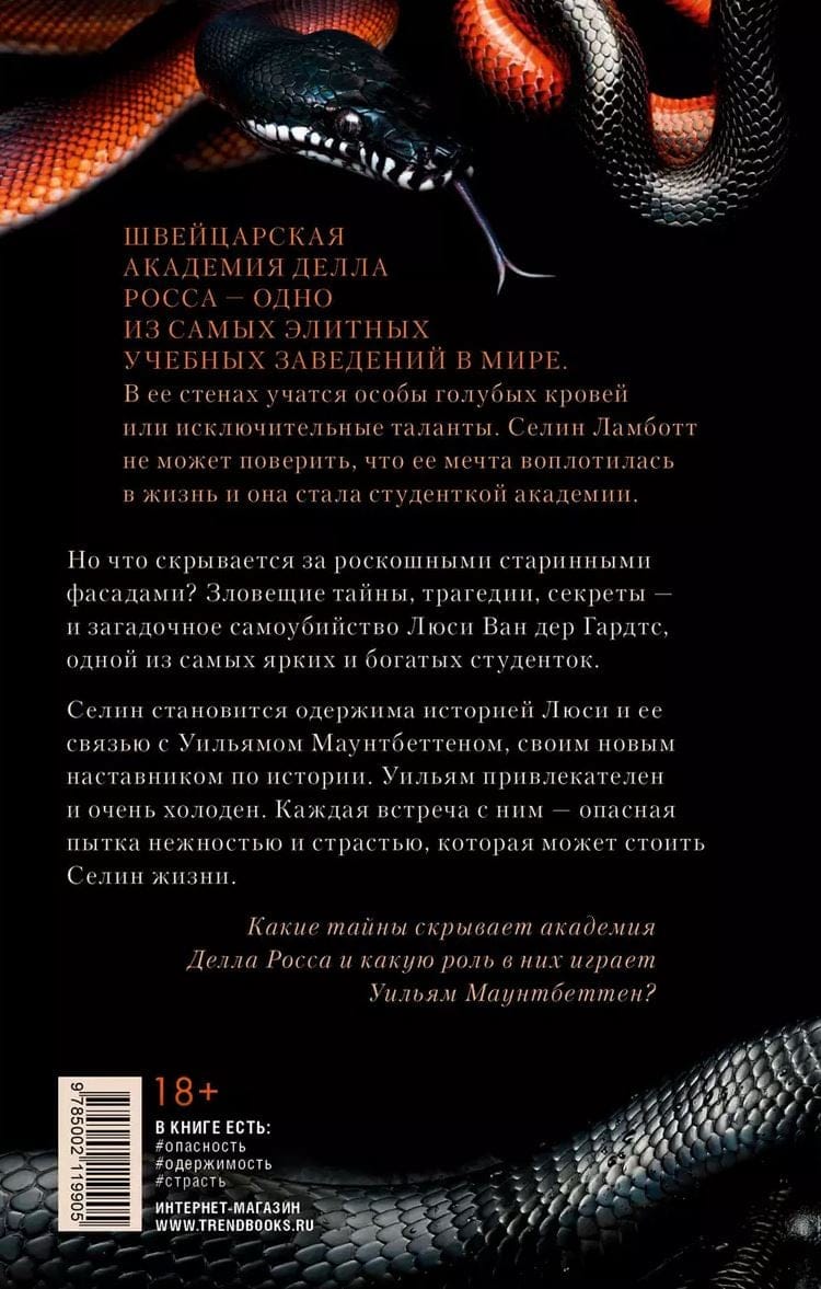 Мечта Селин Ламботт сбылась: она стала студенткой академии Делла Росса, где учатся только особы голубых кровей или обладатели исключительного таланта. Но какие зловещие секреты скрываются за роскошными фасадами академии? Например, загадочное самоубийство одной из самых ярких и богатых студенток Люси Ван дер Гардтс. Селин становится одержима этой историей и ее связью с Уильямом Маунтбеттеном, своим новым наставником по истории. Каждая встреча с ним — опасная пытка нежностью и страстью, которая может стоить Селин жизни…