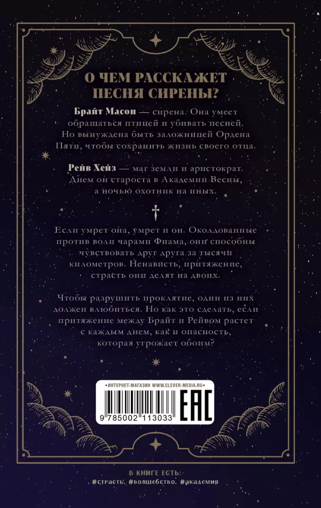 Брайт Масон — сирена. Она умеет обращаться птицей и убивать песней. Но вынуждена быть заложницей Ордена Пяти, чтобы сохранить жизнь своего отца.Рейв Хейз — маг земли и аристократ. Днем он староста в Академии Весны, а ночью охотник на иных.Если умрет она, умрет и он. Околдованные против воли чарами Фиама, они способны чувствовать друг друга за тысячи километров. Ненависть, притяжение, страсть они делят на двоих.Чтобы разрушить проклятие, один из них должен влюбиться. Но как это сделать, если притяжение между Брайт и Рейвом растет с каждым днем, как и опасность, которая угрожает обоим?