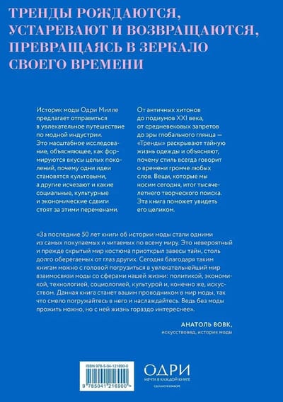 Тренды рождаются, устаревают и возвращаются, превращаясь в зеркало своего времени. Историк моды Одри Милле предлагает отправиться в увлекательное путешествие по истории модной индустрии. Это масштабное исследование, объясняющее, как формируются вкусы целых поколений и почему одни идеи становятся культовыми, а другие исчезают, и какие социальные, культурные и экономические сдвиги стоят за этими переменами. От античных хитонов до подиумов XXI века, от средневековых запретов до эры глобального глянца — «Тренды» раскрывают тайную жизнь одежды и объясняют, почему стиль всегда говорит о времени громче любых слов. Одежда, которую мы носим сегодня, итог тысячелетнего творческого поиска. Эта книга поможет увидеть его целиком.