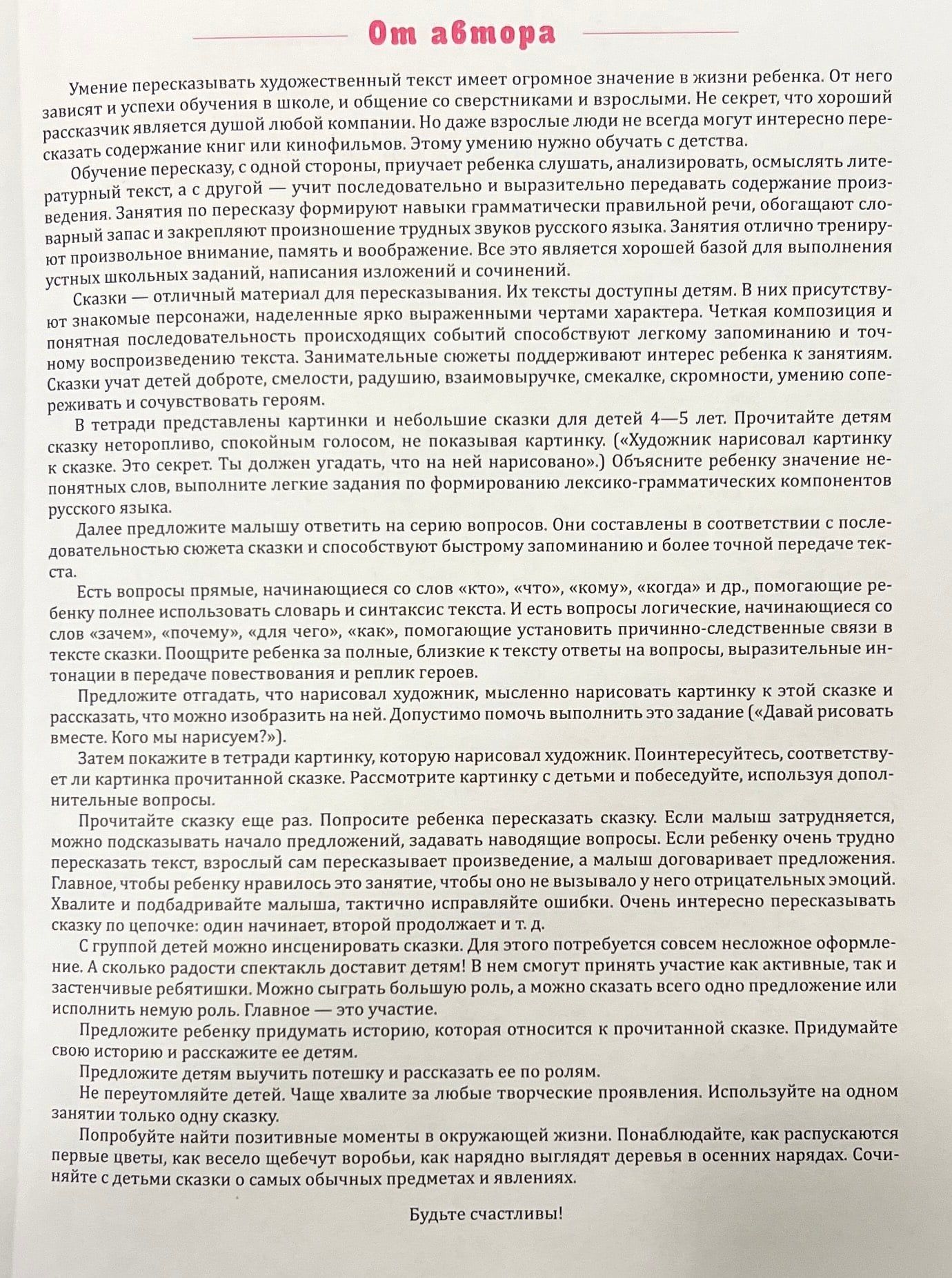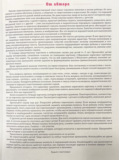 В тетради представлены изящные и небольшие по объему образцы литературного творчества, сюжетную основу которых составили предметы и явления окружающего мира, замечательные картинки к этим сюжетам и методические рекомендации автора для проведения тренингов по формированию связной речи у дошкольников на основе сказок. В пособии содержатся задания для развития творческих способностей детей, вопросы для подготовки к пересказу. Герои сказок знакомы детям, это поддерживает интерес к занятиям. А умение обращать внимание на приятные мелочи в обычной жизни положительно сказывается на детской психике. Тетрадь может быть использована в качестве сборника упражнений не только для развития связной речи ребенка, но и для нравственного воспитания, формирования социально приемлемых форм поведения. Полученные детьми знания и умения необходимы для подготовки к обучению в школе. Издание предназначено для педагогов, работающих с детьми 4-5 лет, а также для родителей дошкольников.