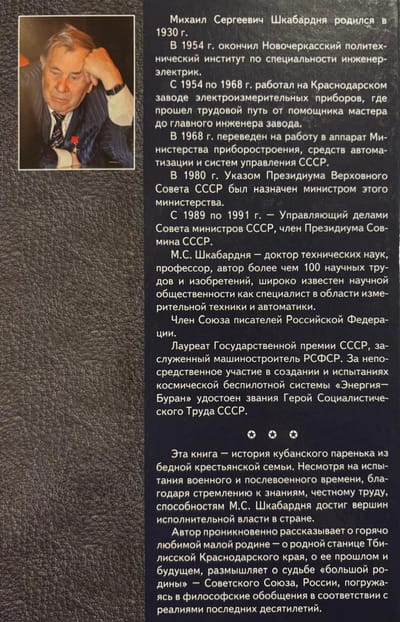 В ваших руках – пронзительное повествование о жизни, написанное Михаилом Сергеевичем Шкабардней – патриархом советской промышленности, Героем Социалистического Труда, лауреатом Государственной премии СССР, доктором технических наук, профессором. Это не только история о кубанском пареньке из бедной казацкой семьи, который, несмотря на испытания 1930-х годов, военного и послевоенного времени, благодаря стремлению к знаниям, честному труду, способностям был выдвинут к вершинам исполнительной власти в стране – стал Министром приборостроения, средств автоматизации и систем управления СССР, а потом и Управляющим делами Совета министров СССР, членом Президиума Советского Правительства, но это еще и рассказ о горячо любимой малой родине автора книги – о родной станице Тбилисской, о Краснодарском крае. Это размышления о судьбе «большой родины» – Советском Союзе, России, широкие философские обобщения на материале последних десятилетий. Некоторые из рассказов были опубликованы в ранее изданных его книгах.