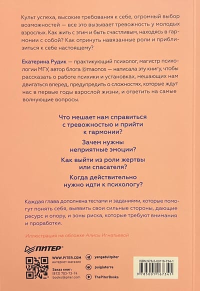 Екатерина Рудик — практикующий психолог, магистр психологии МГУ, автор блога @maonos — написала эту книгу, чтобы рассказать о работе психики и установках, мешающих нам двигаться вперед, предупредить о сложностях, которые ждут нас в первые годы взрослой жизни, и ответить на самые волнующие вопросы.