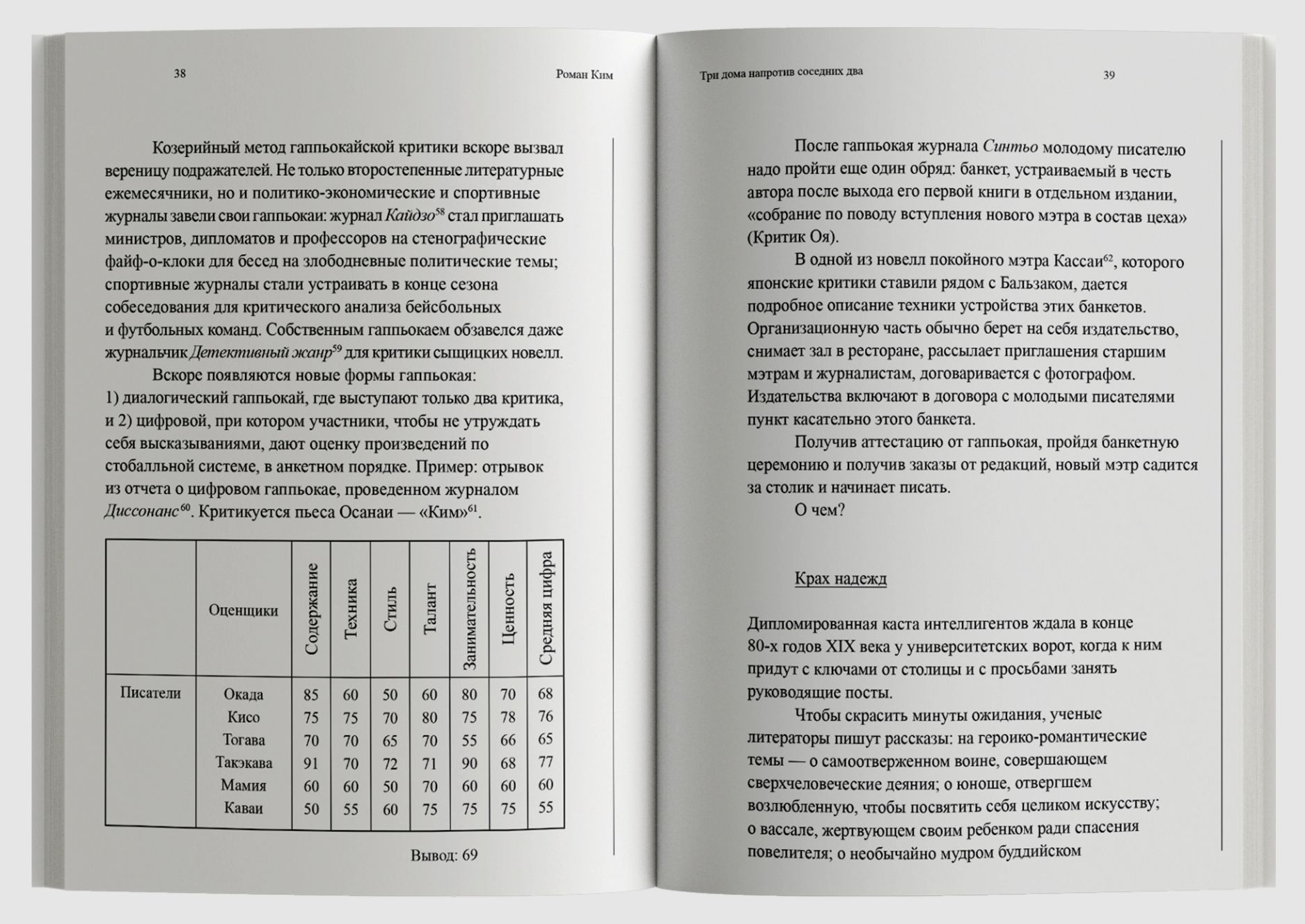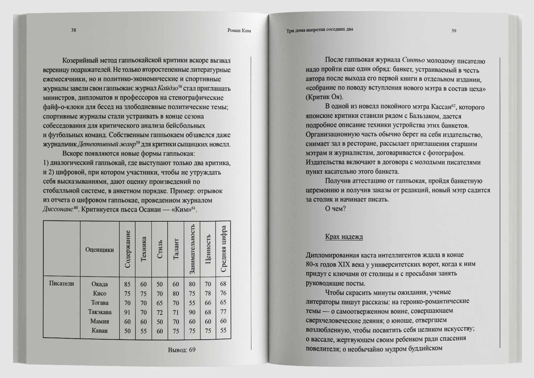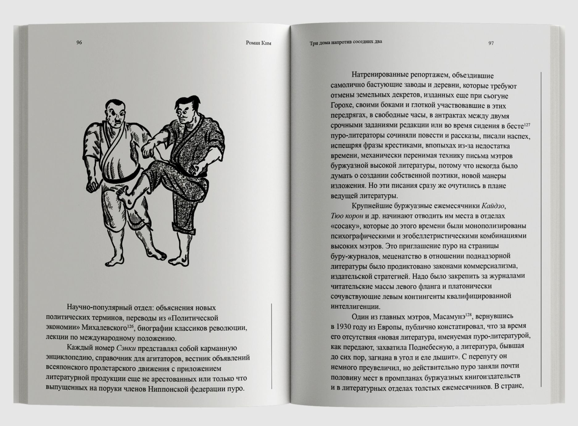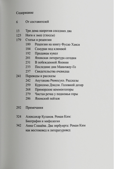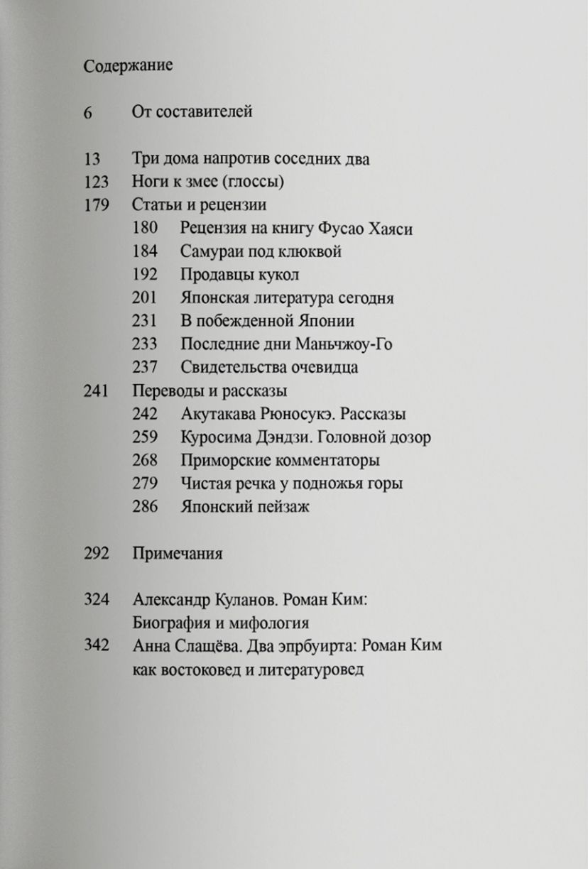 В своих очерках Ким описывает культурную лихорадку, охватившую новую Японию, и ее приготовления к войне. Его волнует «дьявольски энергичная» общественная жизнь страны: европейское влияние и духовные искания молодежи, головокружительные виражи моды, литературные скандалы и классовые конфликты. В сборник вошли памфлет «Три дома напротив соседних два» (1934), глоссы «Ноги к змее» (1927), а также избранные статьи, рецензии, рассказы и переводы. Книгу сопровождает подробный комментарий японистки Анны Слащёвой и статья биографа Кима Александра Куланова.