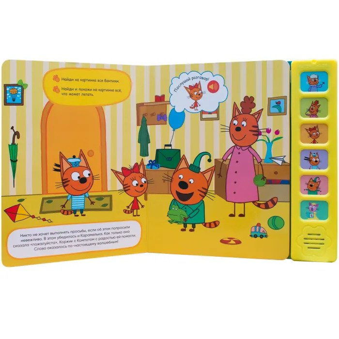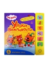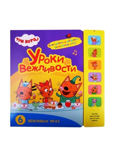 Книга «Уроки вежливости» с 6 звуковыми кнопками серии «Три кота. Звуковые книжки» познакомит ребенка с самыми главными вежливыми словами. Веселая история о приключениях Коржика, Карамельки и Компота расскажет, почему так важны волшебные слова, когда и для чего их нужно использовать. Звуковые фрагменты в книге — подходящие вежливые фразы и диалоги героев мультфильма. При повторном нажатии на кнопку звук можно выключить. Также на страницах книги ребенка ждут занимательные задания на развитие логики, внимания и обучение счету.
