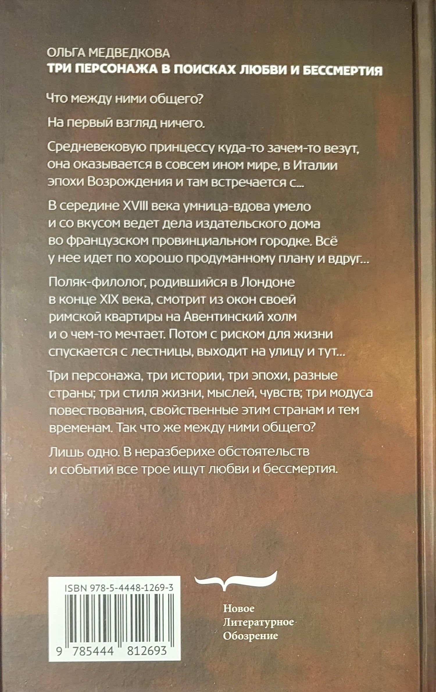 Что между ними общего? На первый взгляд ничего. Средневековую принцессу куда-то зачем-то везут, она оказывается в совсем ином мире, в Италии эпохи Возрождения и там встречается с... В середине XVIII века умница-вдова умело и со вкусом ведет дела издательского дома во французском провинциальном городке. Все у нее идет по хорошо продуманному плану и вдруг... Поляк-филолог, родившийся в Лондоне в конце XIX века, смотрит из окон своей римской квартиры на Авентинский холм и о чем-то мечтает. Потом с риском для жизни спускается с лестницы, выходит на улицу и тут... Три персонажа, три истории, три эпохи, разные страны; три стиля жизни, мыслей, чувств; три модуса повествования, свойственные этим странам и тем временам. Так что же между ними общего? Лишь одно. В неразберихе обстоятельств и событий все трое ищут любви и бессмертия. Ольга Медведкова — прозаик, историк искусства и архитектуры, старший научный сотрудник Национального центра научных исследований Франции.