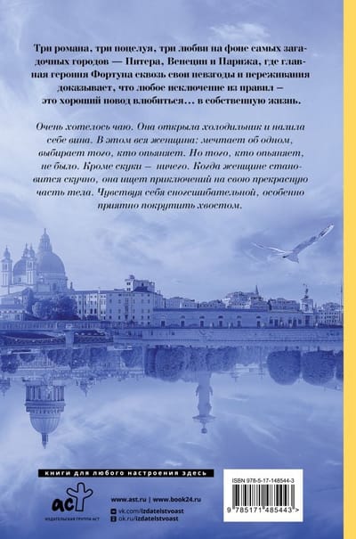 Очень хотелось чаю. Она открыла холодильник и налила себе вина. В этом вся женщина: мечтает об одном, выбирает того, кто опьяняет. Но того, кто опьяняет, не было. Кроме скуки – ничего. Когда женщине становится скучно, она ищет приключений на свою прекрасную часть тела. Чувствуя себя сногсшибательной, особенно приятно покрутить хвостом. Три романа, три поцелуя, три любви на фоне самых загадочных городов Питера, Венеции и Парижа, где главная героиня Фортуна, сквозь свои невзгоды и переживания доказывает, что любое исключение из правил – это хороший повод влюбиться… в собственную жизнь.