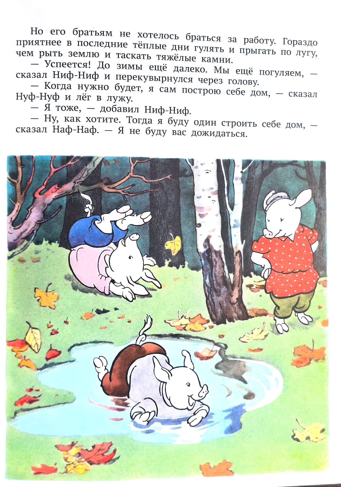 Одна из самых популярных сказок для детей в мире — «Три поросёнка». С XIX века известна английская народная сказка про трёх поросят. Взяв за основу народную сказку, классик отечественной детской литературы Сергей Владимирович Михалков в 30-е годы ХХ века пересказал её. У каждого поросёнка появилось не только своё собственное имя: Ниф-Ниф, Нуф-Нуф, Наф-Наф, но и свой собственный характер. Персонажи сказки стали петь весёлые песенки. Поросятам пришлось пройти через все испытания и на своём примере показать маленькому читателю, как правильно взрослеть, как стать сильным и счастливым «поросёнком».