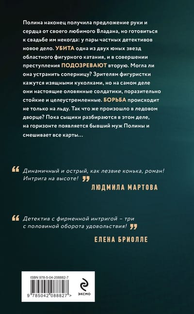 Полина наконец получила предложение руки и сердца от своего любимого Владана, но готовиться к свадьбе им некогда: у пары частных детективов новое дело. Убита одна из двух юных звезд областного фигурного катания, и в совершении преступления подозревают вторую. Могла ли она устранить соперницу? Зрителям фигуристки кажутся изящными куколками, но на самом деле они настоящие оловянные солдатики, поразительно стойкие и целеустремленные. Борьба происходит не только на льду. Так что же произошло в ледовом дворце? Пока сыщики разбираются в этом деле, на горизонте появляется бывший муж Полины и смешивает все карты…