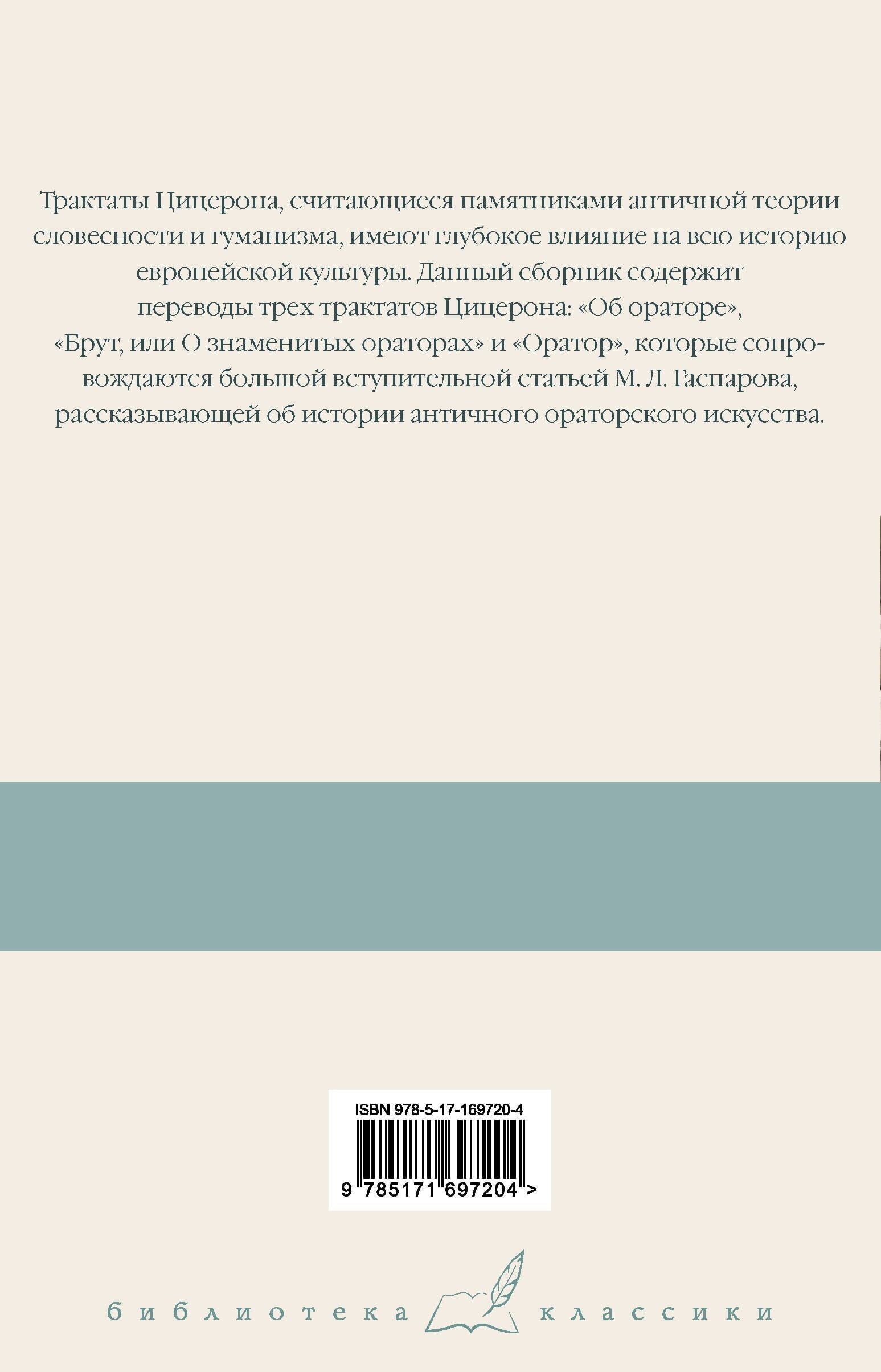 Данный сборник содержит переводы трех трактатов Цицерона: «Об ораторе», «Брут, или О знаменитых ораторах» и «Оратор», которые сопровождаются большой вступительной статьей М. Л. Гаспарова, рассказывающей об истории античного ораторского искусства.