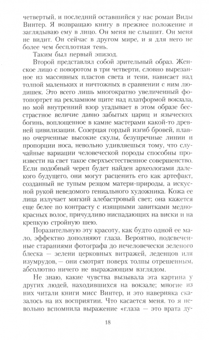 Маргарет Ли работает в букинистической лавке своего отца. Современности она предпочитает Диккенса и сестер Бронте. Тем больше удивление Маргарет, когда она получает от самой знаменитой писательницы наших дней Виды Винтер предложение стать ее биографом. Ведь ничуть не меньше, чем своими книгами, мисс Винтер знаменита тем, что еще не сказала ни одному интервьюеру ни слова правды. И вот перед Маргарет, оказавшейся в стенах мрачного, населенного призраками прошлого особняка, разворачивается в буквальном смысле слова готическая история сестер-близнецов, которая странным образом перекликается с ее личной историей и постепенно подводит к разгадке тайны, сводившей с ума многие поколения читателей, — тайне «Тринадцатой сказки».