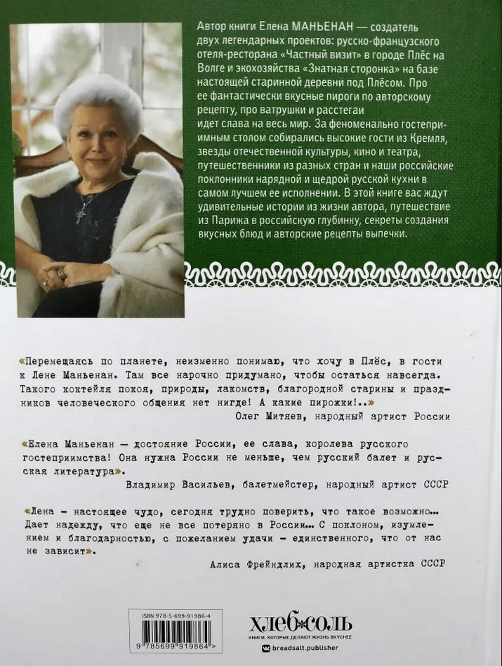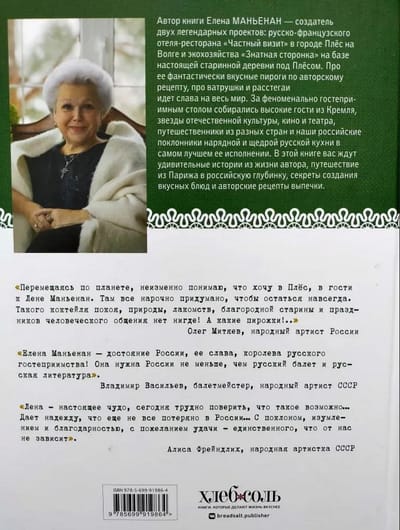 Елену Маньенан называют королевой русского гостеприимства. Ее гостевой дом и ресторан в Плёсе на живописном берегу Волги - место притяжения всех, кто любит русскую кухню в ее исконном исполнении. За столом у Маньенан собираются премьер-министр и высокопоставленные сотрудники Белого дома, все самые яркие звезды российской культуры, литературы, кино и телевидения, а также простые путешественники из всех уголков России и мира.