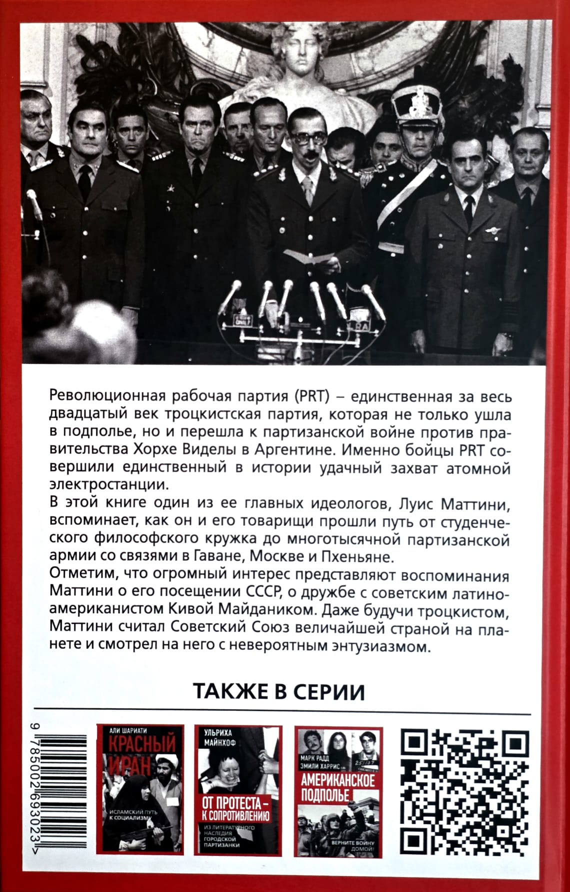Революционная рабочая партия (PRT) – единственная за весь двадцатый век троцкистская партия, которая не только ушла в подполье, но и перешла к партизанской войне против правительства Хорхе Виделы. Именно бойцы PRT совершили единственный в истории удачный захват атомной электростанции. В этой книге один из ее главных идеологов, Луис Маттини, вспоминает, как он и его товарищи прошли путь от студенческого философского кружка до многотысячной партизанской армии со связями в Гаване, Москве и Пхеньяне. Отметим, что огромный интерес представляют воспоминания Маттини о его посещении СССР, о дружбе с советским латиноамериканистом Кивой Майдаником. Даже будучи троцкистом, Маттини считал Советский Союз величайшей страной на планете и смотрел на него с невероятным энтузиазмом.