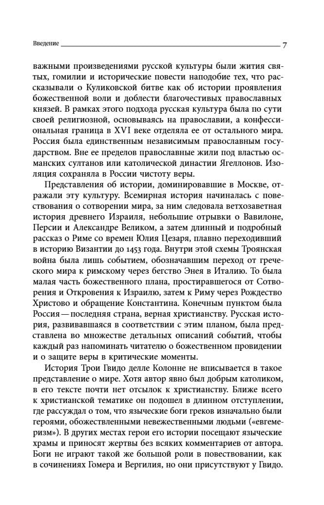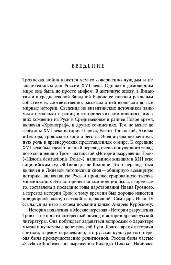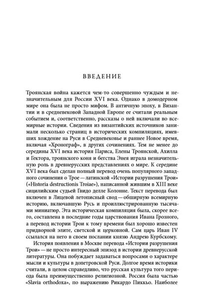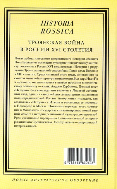 Новая работа известного американского историка-слависта Пола Бушковича посвящена культурно-историческому контексту появления в России XVI века перевода «Истории о разрушении Трои», написанной сицилийцем Гвидо делле Колонне в XIII столетии. Среди читателей этого труда, основанного на сюжетах античной литературы и мифологии, был царь Иван IV: в частности, он упоминается в первом послании к политическому оппоненту — князю Андрею Курбскому. Полный текст «Истории» был впоследствии включен в Лицевой летописный свод, один из известнейших литературных памятников позднесредневековой России. Автор книги исследует, как создавалась «История» в Италии и готовились ее переводы в Новгороде и Москве. Появление перевода этого сочинения в Московском государстве символизировало новый важный момент в истории религиозной культуры допетровской Руси, связанный с апроприацией канонов светской литературы западного Средневековья. Пол Бушкович — американский историк-славист.