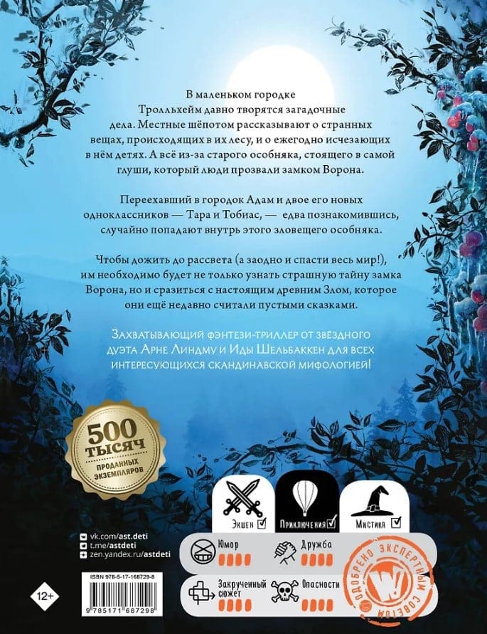 В маленьком городке Тролльхейм давно творятся загадочные дела. Местные шёпотом рассказывают о странных вещах, происходящих в их лесу, и о ежегодно исчезающих в нём детях. А всё из-за старого особняка, стоящего в самой глуши, который люди прозвали замком Ворона. Переехавший в городок Адам и двое его новых одноклассников — Тара и Тобиас, — едва познакомившись, случайно попадают внутрь этого зловещего особняка. Чтобы дожить до рассвета (а заодно и спасти весь мир!), им необходимо будет не только узнать страшную тайну замка Ворона, но и сразиться с настоящим древним Злом, которое они ещё недавно считали пустыми сказками. Захватывающий фэнтези-триллер от звёздного дуэта Арне Линдму и Иды Шельбаккен для всех интересующихся скандинавской мифологией!