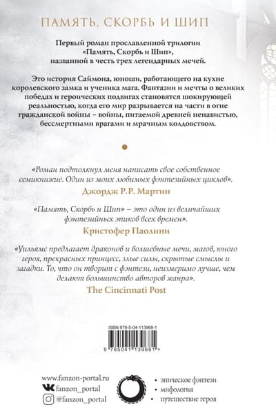 Первый роман прославленной трилогии «Память, Скорбь и Шип», названной в честь трех легендарных мечей. Это история Саймона, юноши, работающего на кухне королевского замка и ученика мага. Фантазии и мечты о великих победах и героических подвигах становятся шокирующей реальностью, когда его мир разрывается на части в огне гражданской войны – войны, питаемой древней ненавистью, бессмертными врагами и мрачным колдовством.
