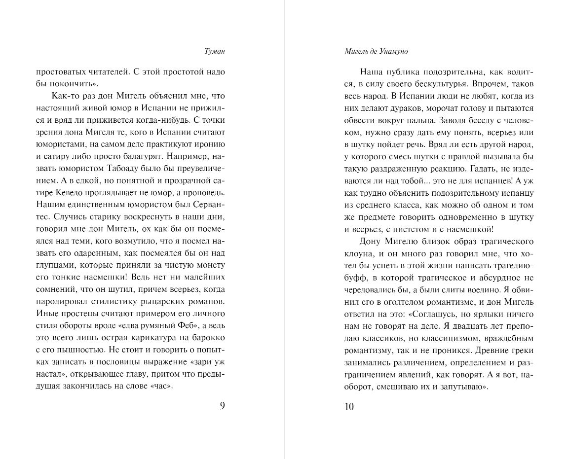 Мигель де Унамуно — испанский классик и философ. В противовес роману он изобрел жанр «нивола» (или «раман»), изменив литературные правила игры. Унамуно в «Тумане» делает читателя соавтором и позволяет выбрать один из двух вариантов концовки.