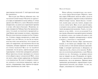 Герой «Тумана» — это одновременно и «маленький Гамлет», и Дон Кихот. Помимо аллюзий на Шекспира и Сервантеса в тексте можно уловить отсылки на произведения Достоевского «Записки из подполья» и «Бесы».
