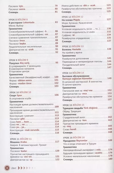 В каждом уроке самоучителя вы найдёте описания лексико-грамматических категорий всех частей речи, упражнения на запоминание изученного материала, тексты с использованием активных речевых структур. Для проверки сделанных упражнений в конце книги даются поурочные ключи. Уроки самоучителя дополнены словарём, которым можно воспользоваться для перевода незнакомых слов, встречающихся в упражнениях. Есть в книге и информация страноведческого характера, которая, без сомнения, пригодится во время путешествия по Турции.
