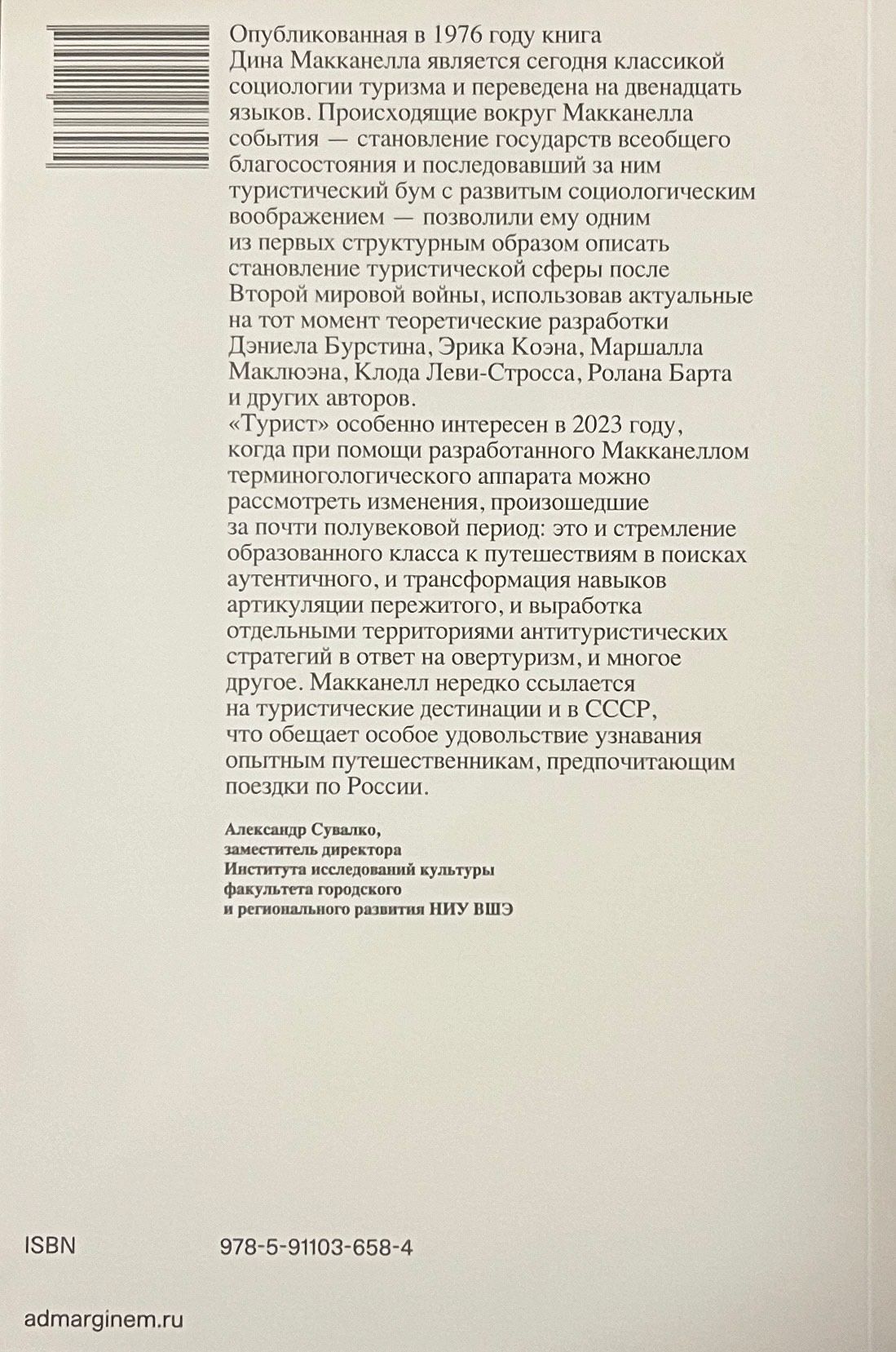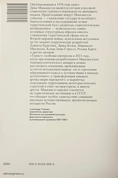 В своей работе Дин Макканелл, профессор ландшафтной архитектуры Калифорнийского университета в Дейвисе, исследует понятия аутентичности, элитарной и популярной культуры, связанные с построением социальной реальности вокруг феномена туризма, захватившего западный мир во второй половине XX века. Макканелл проявляет интерес к взаимосвязи индивидуального поведения и социальных отношений, изучению «поведения туристов и мест их путешествий, чтобы лучше понять скрытые структуры и значения жизни в конце современной эпохи». Идея «Туриста» зародилась и развивалась в рамках социологии, однако подобно феномену, который она изучает, книга покинула родную дисциплину и распространилась далеко за ее пределы. Впервые книга была опубликована в 1976 году и вместе со cборником эссе «Empty Meeting Grounds: The Tourist Papers» (1992), закрепившим за Макканеллом репутацию выдающегося исследователя туризма, остается неоценимой как для ученых, так и для заинтересованных наблюдателей.