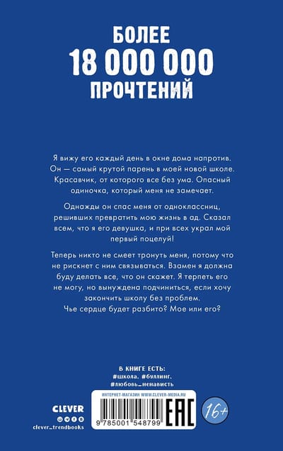 Я вижу его каждый день в окне дома напротив. Он – самый крутой парень в моей новой школе. Красавчик, от которого все без ума. Опасный одиночка, который меня не замечает. Однажды он спас меня от одноклассниц, решивших превратить мою жизнь в ад. Он сказал всем, что я его девушка, и украл мой первый поцелуй при всех! Теперь никто не смеет меня тронуть, потому что никто не рискнет с ним связываться. Взамен я должна делать все, что он скажет. Я терпеть его не могу, но вынуждена подчиниться, если хочу закончить школу без проблем. Чье сердце будет разбито? Мое или его?