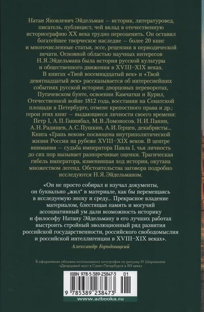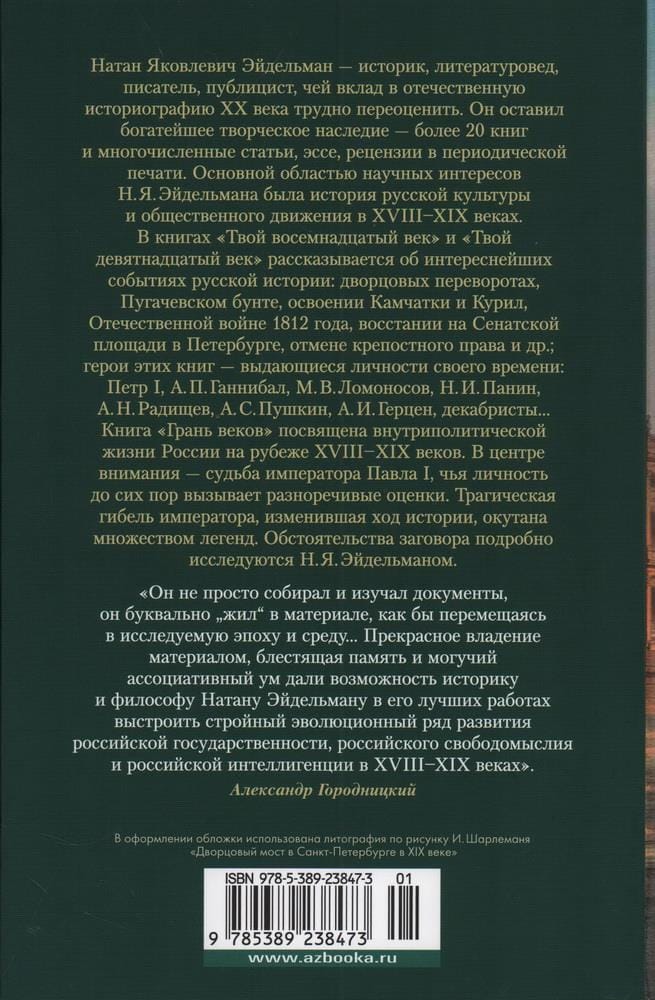 Натан Яковлевич Эйдельман — историк, литературовед, писатель, публицист, чей вклад в отечественную историографию ХХ века трудно переоценить. Он оставил богатейшее творческое наследие — более 20 книг и многочисленные статьи, эссе, рецензии в периодической печати. Основной областью научных интересов Н. Я. Эйдельмана была история русской культуры и общественного движения в XVIII–XIX веках. В книгах «Твой восемнадцатый век» и «Твой девятнадцатый век» рассказывается об интереснейших событиях русской истории: дворцовых переворотах, Пугачевском бунте, освоении Камчатки и Курил, Отечественной войне 1812 года, восстании на Сенатской площади в Петербурге, отмене крепостного права и др.; герои этих книг — выдающиеся личности своего времени: Петр I, А. П. Ганнибал, М. В. Ломоносов, Н. И. Панин, А. Н. Радищев, А. С. Пушкин, А. И. Герцен, декабристы... Книга «Грань веков» посвящена внутриполитической жизни России на рубеже XVIII–XIX веков. В центре внимания — судьба императора Павла I, чья личность до сих пор вызывает разноречивые оценки. Трагическая гибель императора, изменившая ход истории, окутана множеством легенд. Обстоятельства заговора подробно исследуются Н. Я. Эйдельманом.