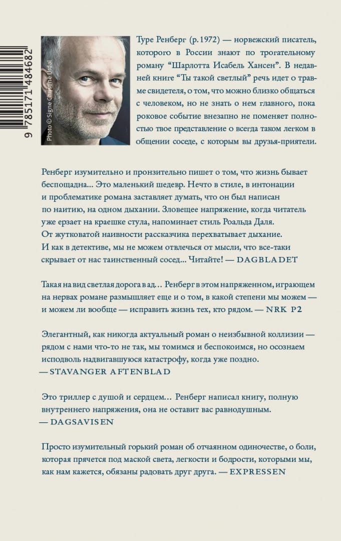 «Ты такой светлый» — глубокий психологический роман, захватывающее многогранное повествование о потемках чужой души. О том, чего мы не можем видеть, даже если драма разыгрывается буквально у нас на глазах. Йорген и Вибеке живут в небольшом прибрежном поселке, соседский дом пустует, его бывшие владельцы развелись, и маклер возит туда странноватых клиентов на просмотры. Когда в конце концов в доме за живой изгородью поселяется семья их сверстников с обаятельным отцом семейства, бойким балагуром, да еще и врачом, всегда готовым прийти на помощь, Йорген и Вибеке не скрывают радости. Они быстро становятся хорошими друзьями с новыми соседями. И вот уже отцы семейств едут вместе в Лондон, на футбольный матч. Но там Йорген внезапно становится свидетелем чего‑то необъяснимого, о чем и спросить неловко. Дальше больше, оказывается, и Вибеке подозревает Стейнара в двуличии. Кто он на самом деле? Что скрывается за его кипучей энергией и пленяющей обходительностью? Произведения Туре Ренберга переведены на двадцать с лишним языков, экранизированы и отмечены многими наградами. Русскому читателю он известен романом «Шарлотта Исабель Хансен».