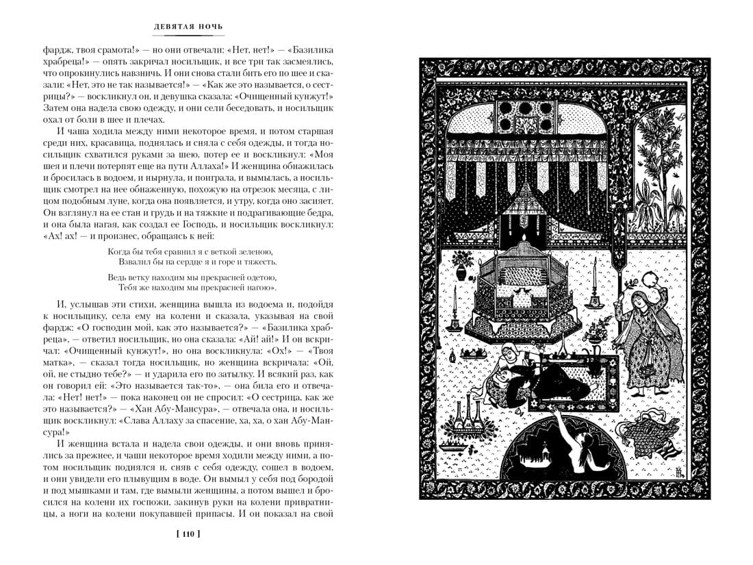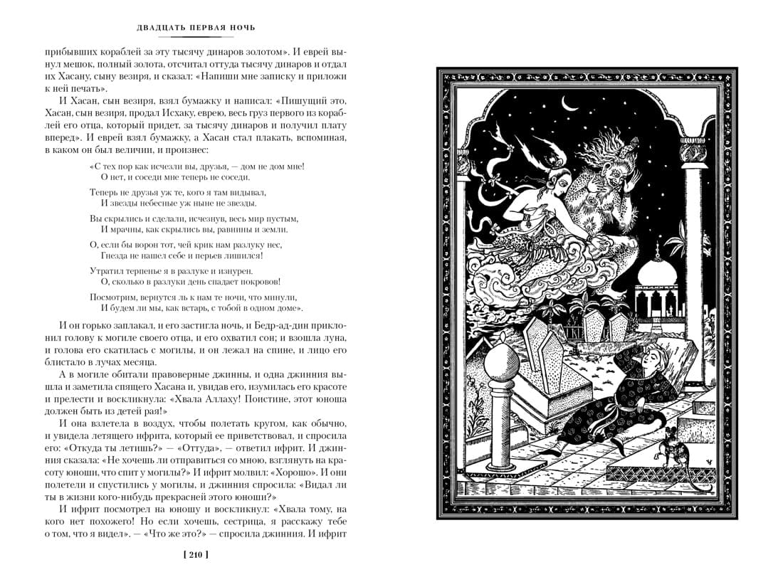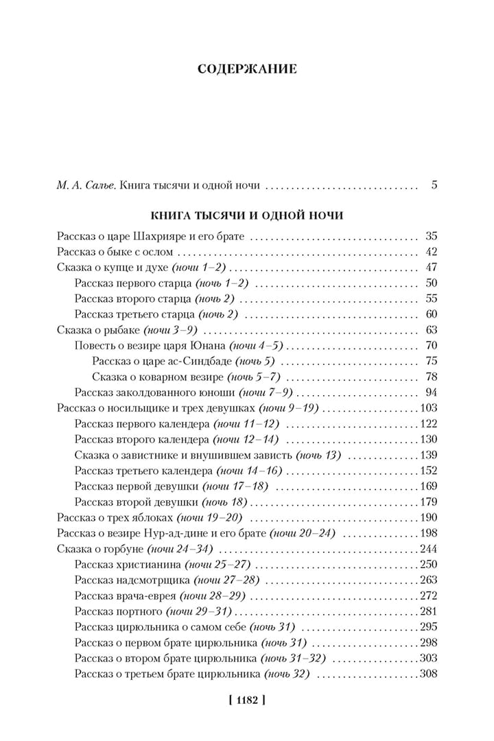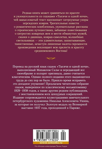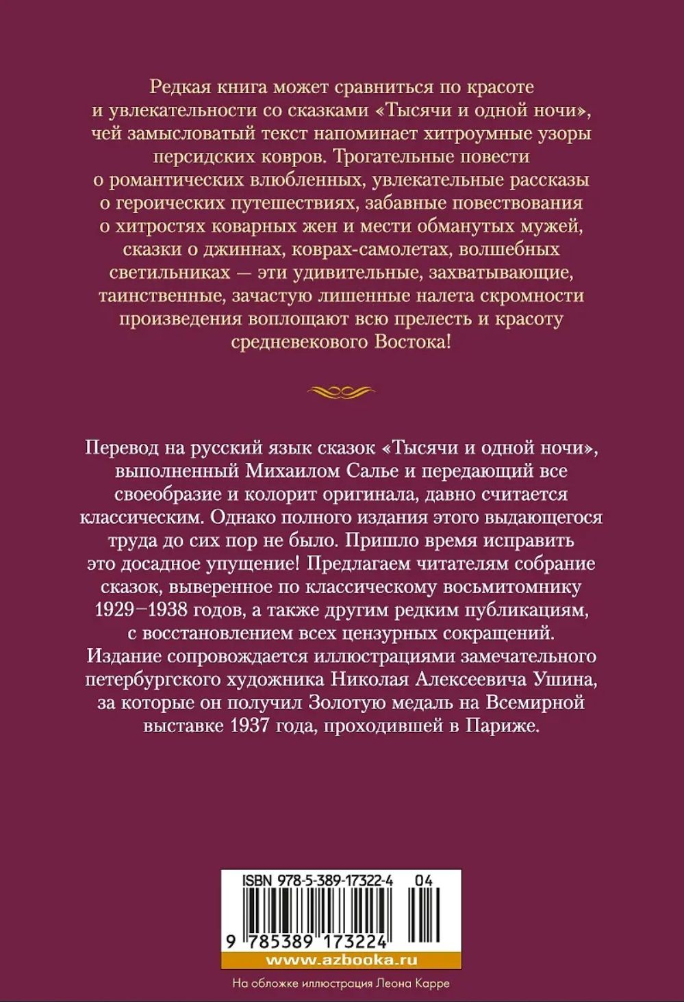 Редкая книга может сравниться по красоте и увлекательности со сказками «Тысячи и одной ночи», чей замысловатый текст напоминает хитроумные узоры персидских ковров. Трогательные повести о романтических влюбленных, увлекательные рассказы о героических путешествиях, забавные повествования о хитростях коварных жен и мести обманутых мужей, сказки о джиннах, коврах-самолетах, волшебных светильниках - эти удивительные, захватывающие, таинственные зачастую лишенные налета скромности произведения воплощают всю прелесть и красоту средневекового Востока! Перевод на русский язык сказок «Тысячи и одной ночи», выполненный Михаилом Салье и передающий всё своеобразие и колорит оригинала, давно считается классикой отечественной литературы. Однако полного издания этого выдающегося труда до сих пор не было. Пришло время исправить это досадное упущение! Предлагаем читателям собрание сказок, выверенное по классическому восьмитомнику 1929-1939 годов, а также другим редким публикациям, с восстановлением всех цензурных сокращений. Издание сопровождается иллюстрациями замечательного петербургского художника Николая Алексеевича Ушина, за которые он получил Золотую медаль на Всемирной выставке 1937 года, проходившей в Париже. В первую книгу вошли сказки, рассказанные Шахразадой в 1-270 ночи.