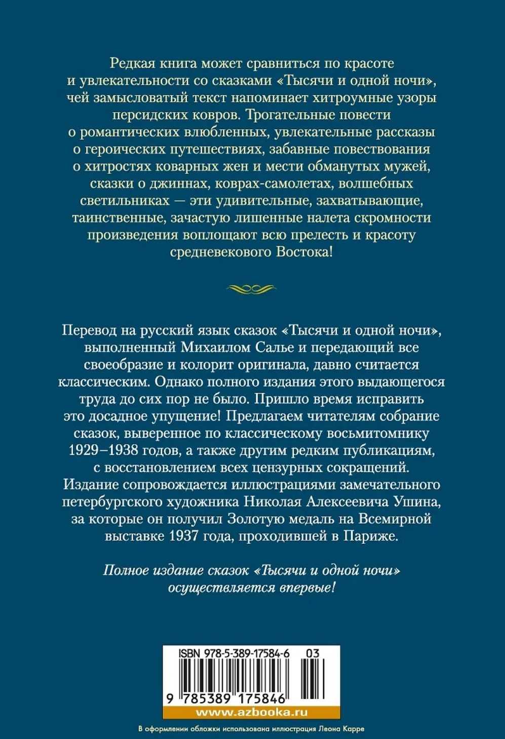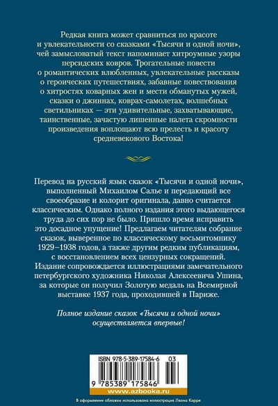 Редкая книга может сравниться по красоте и увлекательности со сказками «Тысячи и одной ночи», чей замысловатый текст напоминает хитроумные узоры персидских ковров. Трогательные повести о романтических влюбленных, увлекательные рассказы о героических путешествиях, забавные повествования о хитростях коварных жен и мести обманутых мужей, сказки о джиннах, коврах-самолетах, волшебных светильниках — эти удивительные, захватывающие, таинственные зачастую лишенные налета скромности произведения воплощают всю прелесть и красоту средневекового Востока! Перевод на русский язык сказок «Тысячи и одной ночи», выполненный Михаилом Салье и передающий всё своеобразие и колорит оригинала, давно считается классическим. Однако полного издания этого выдающегося труда до сих пор не было. Пришло время исправить это досадное упущение! Предлагаем читателям собрание сказок, выверенное по классическому восьмитомнику 1929–1939 годов, а также другим редким публикациям, с восстановлением всех цензурных сокращений. Издание сопровождается иллюстрациями замечательного петербургского художника Николая Алексеевича Ушина, за которые он получил Золотую медаль на Всемирной выставке 1937 года, проходившей в Париже. Во вторую книгу вошли сказки, рассказанные Шахразадой в 271–719 ночи.