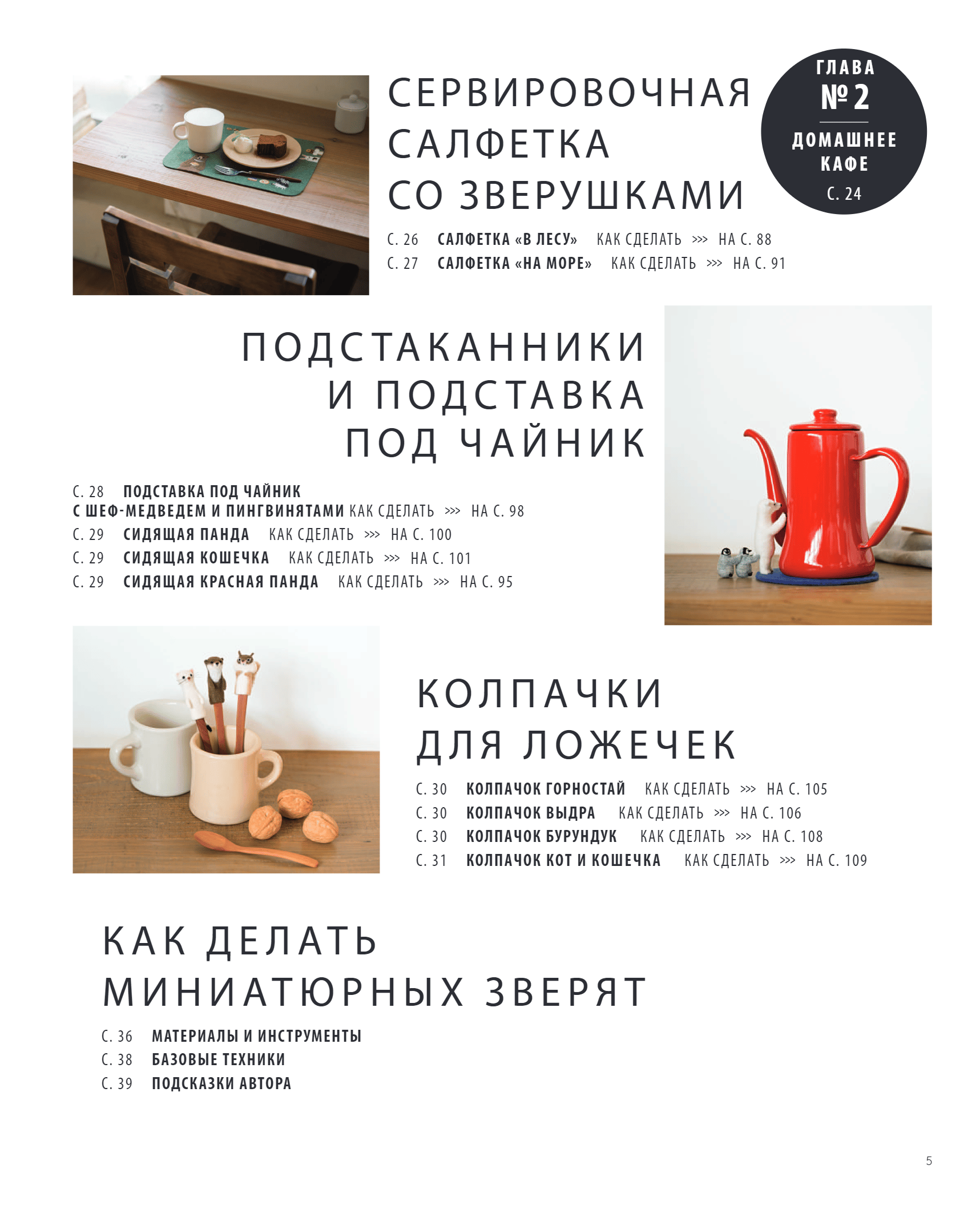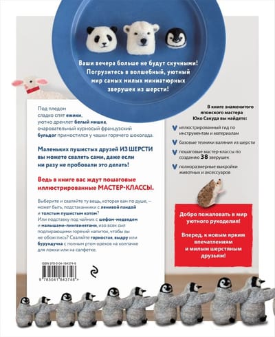Создайте домашнее кафе с самыми милыми зверушками из шерсти, которых вы когда-либо видели! Эта книга — красочное пособие для начинающих и опытных мастеров по фелтингу. От сладко спящих под пледом ежиков до очаровательного французского бульдога, примостившегося у чашки горячего шоколада, каждый обитатель этой книги может стать вашим новым пушистым домашним питомцем! Шаг за шагом следуя подробным инструкциям автора, вы сможете создать собственное домашнее кафе с тематическими сервировочными салфетками, подстаканниками, подставками под чайник и даже колпачками для ложечек.