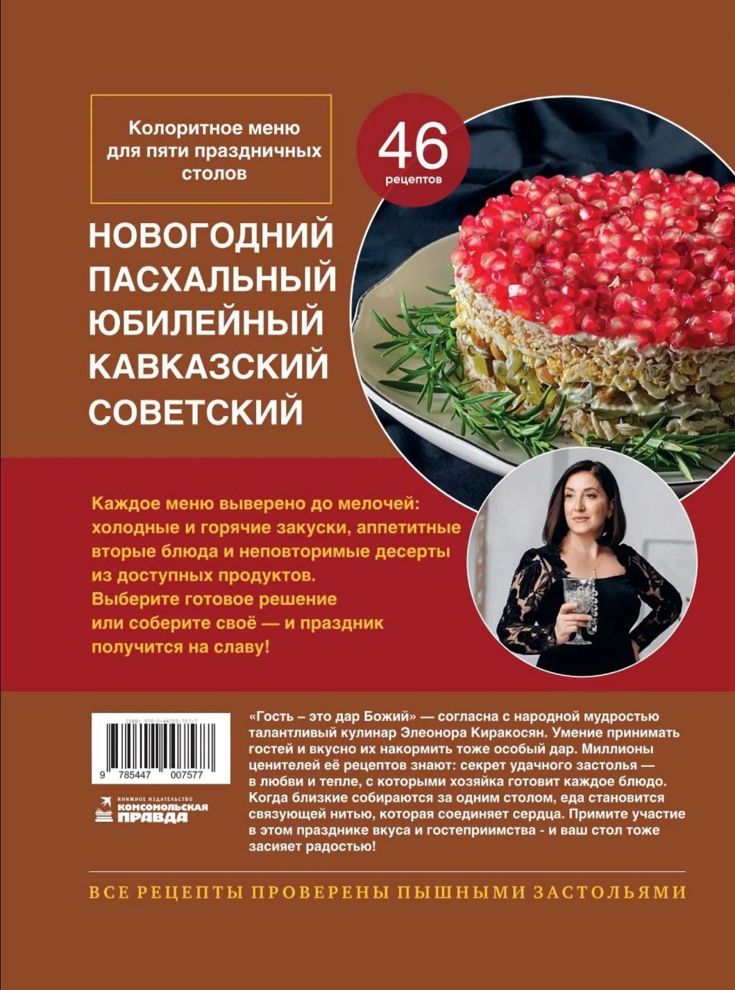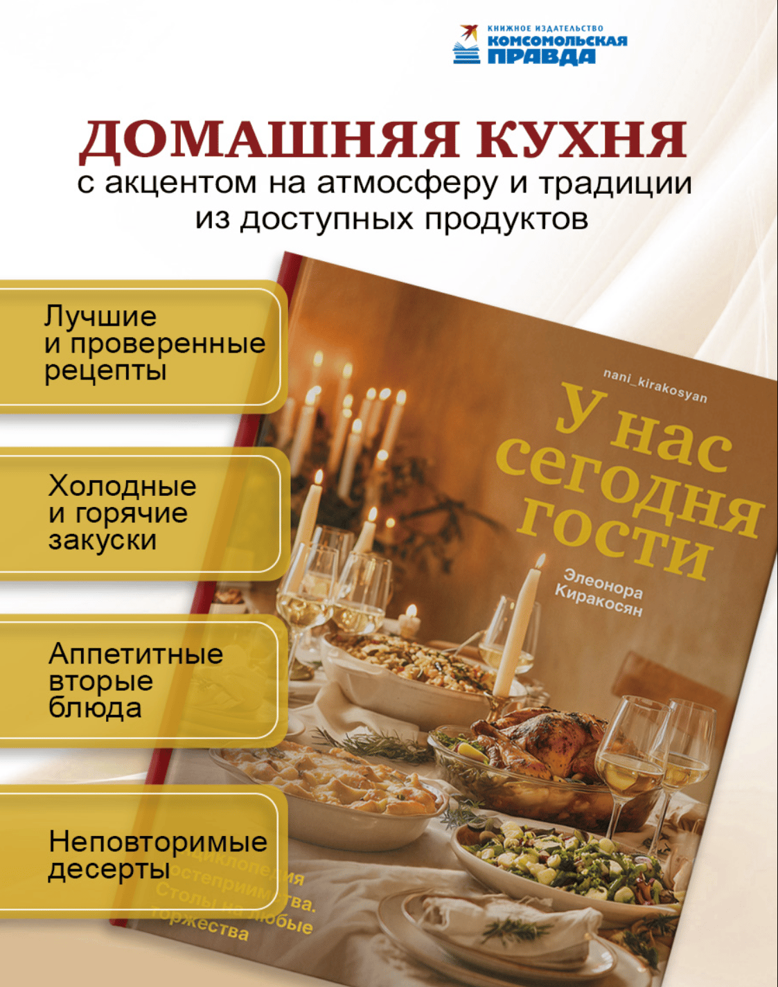 Искусство гостеприимства бесценно. Для популярного кулинара Нани Киракосян принимать гостей и накрывать щедрый стол — настоящее призвание. На страницах этой книги она делится секретами безупречных застолий, которые точно захочется повторить. Меню для пяти самых популярных поводов — Нового года, юбилея, Пасхи, кавказского ужина или ретро-праздника в советском стиле. Каждое из них продумано до мелочей и включает блюда на любой вкус: салат «Оливье», ароматный жульен, рулет из свиной вырезки с грушами и сыром, запечённые перепёлки, сациви, нежная пахлава, торт-эклер «Крокембуш» и многое другое сытное, красивое и, главное, по-домашнему вкусное. Присоединяйтесь к этому празднику вкуса и гостеприимства, и ваш стол засияет радостью.