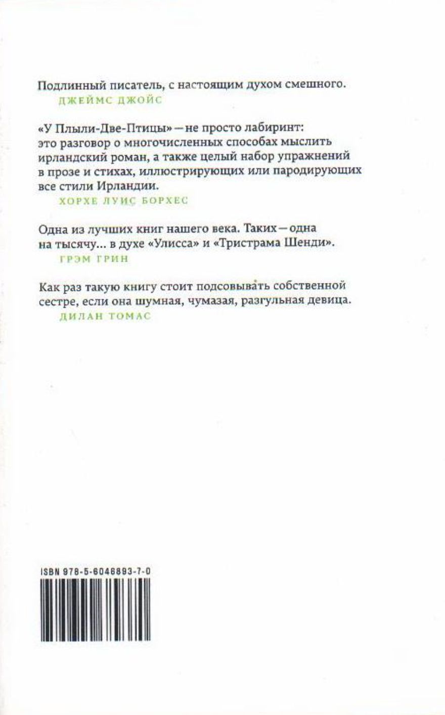 Ленивый и редко трезвый дублинский студент дни напролет полеживает в постели, препирается со своим скрягой-дядей и — пишет роман. Главный герой которого, второсортный писатель, более двадцати лет не склонный вставать с кровати, читает только книги в зеленых обложках и — конечно же, пишет роман. Такой плохой, что персонажи начинают мстить и — писать свой собственный роман, героем которого станет придумавший их автор! Протопостмодернистский и полный отсылок к средневековой литературе Ирландии роман-балаган «У Плыли-Две-Птицы» (1939) — дебют автора «Третьего полицейского», «Поющих Лазаря» и «Архива Долки», уморительный шедевр, стилистическим буйством которого восхищались Джеймс Джойс и Сэмюэл Беккет. Перед вами новый перевод этого памятника ирландской литературы с подробным лингвокультурологическим комментарием.
