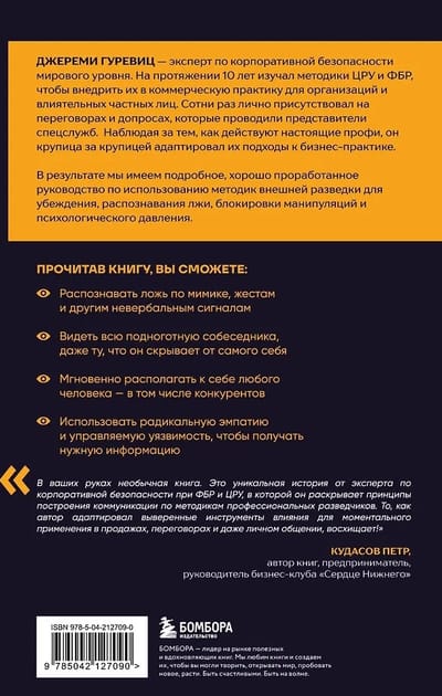 Джереми Гуревиц — эксперт по корпоративной безопасности. На протяжении 10 лет он изучал шпионские методики ЦРУ и ФБР и потом внедрял их в свои системы безопасности для защиты организаций и влиятельных частных лиц. Он также лично участвовал в переговорах с лучшими агентами спецслужб. Наблюдая за их работой, Джереми сделал важное открытие: настоящие разведчики — не денди в смокингах, а эксперты в развитии отношений.
