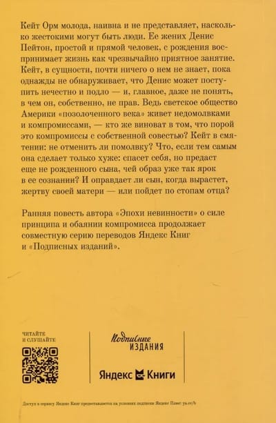 Кейт, в сущности, почти ничего о нем не знает, пока однажды не обнаруживает, что Денис может поступить нечестно и подло — и, главное, даже не понять, в чем он, собственно, не прав. Ведь светское общество Америки «позолоченного века» живет недомолвками и компромиссами, — кто же виноват в том, что порой это компромиссы с собственной совестью?
