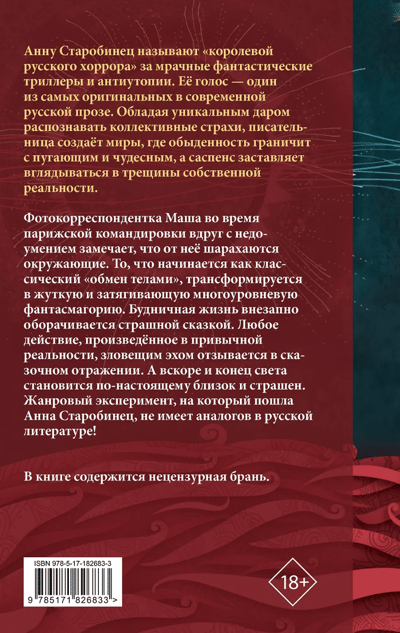 Фотокорреспондентка Маша во время парижской командировки вдруг с недоумением замечает, что от неё шарахаются окружающие. То, что начинается как классический «обмен телами», трансформируется в жуткую и затягивающую многоуровневую фантасмагорию. Будничная жизнь внезапно оборачивается страшной сказкой. Любое действие, произведенное в привычной реальности, зловещим эхом отзывается в сказочном отражении. А вскоре и конец света становится по-настоящему близок и страшен. Жанровый эксперимент, на который пошла Анна Старобинец, не имеет аналогов в русской литературе!