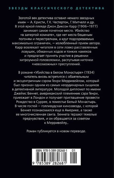Золотой век детектива оставил немало звездных имен — А. Кристи, Г. К. Честертон, Г. Митчелл и др. В этой яркой плеяде Джон Диксон Карр (1906–1977) занимает самое почетное место. «Убийство в запертой комнате», где нет места бешеным погоням и перестрелкам, а круг подозреваемых максимально ограничен, — излюбленный прием автора. Карр вовлекает читателя в сети ловко расставленных ловушек, обманных ходов и тонких намеков и предлагает принять участие в решении хитроумной головоломки, распутывая ниточки «невозможных» преступлений.