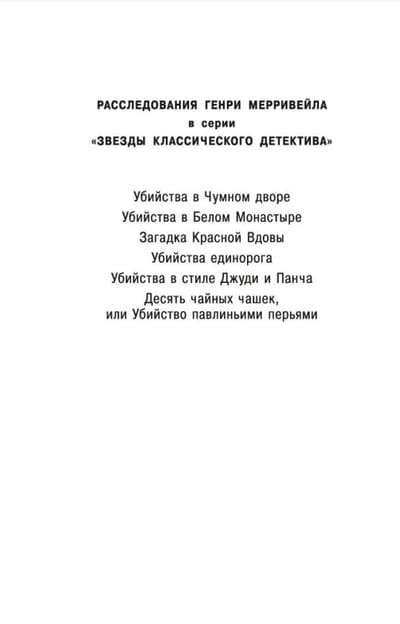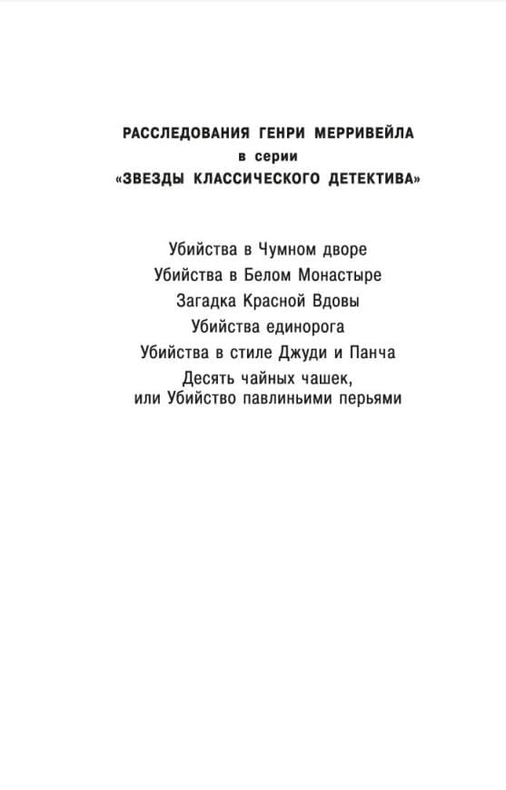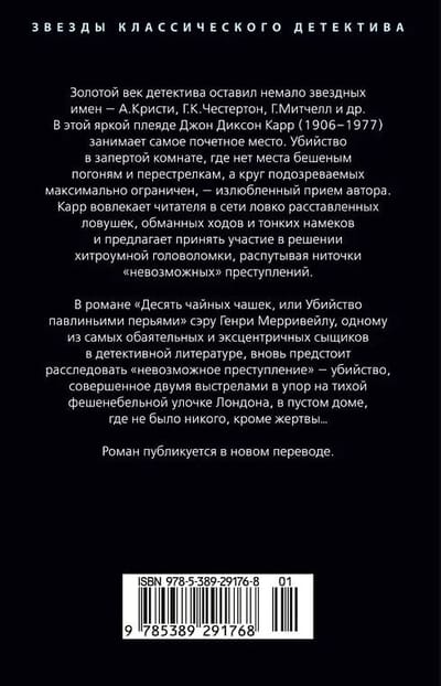 В романе «Десять чайных чашек, или Убийство павлиньими перьями» сэру Генри Мерривейлу, одному из самых обаятельных и эксцентричных сыщиков в детективной литературе, вновь предстоит расследовать «невозможное преступление» — убийство, совершенное двумя выстрелами в упор на тихой фешенебельной улочке Лондона, в пустом доме, где не было никого, кроме жертвы…