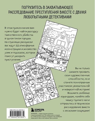 На страницах раскраски вас ждут 22 атмосферные иллюстрации, полные деталей, которые не только вдохновят вас на творчество, но и помогут раскрыть тайну загадочного убийства в тихом городке. Вам предстоит найти улики и подсказки, чтобы разгадать преступление как можно скорее.