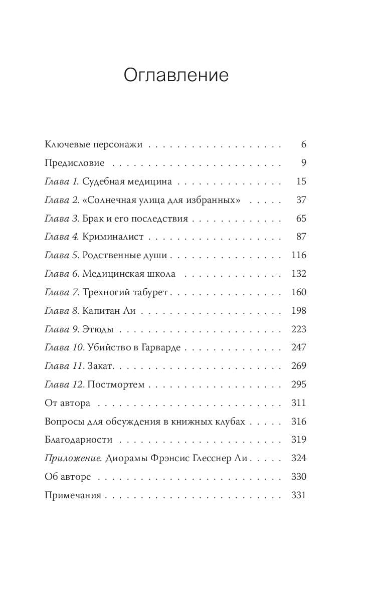 Удивительная история Френсис Глесснер Ли — матери современной криминалистики — и увлекательный рассказ о том, как зарождалась судебная медицина. На протяжении большей части человеческой истории подозрительные смерти практически не расследовались. Убийства в подавляющем большинстве случаев сходили преступникам с рук. Фрэнсис Глесснер Ли, светская львица из богатой и влиятельной чикагской семьи, в силу своего статуса вообще не собиралась делать никакую карьеру, не говоря уже о том, чтобы погрязнуть в расследованиях преступлений. Шли не слишком примечательные годы и десятилетия ее жизни, пока у Фрэнсис неожиданно не появилось необычное хобби. Она познакомилась с судмедэкспертом Джорджем Магратом, который рассказывал ей о случаях из своей практики, а со временем стал пускать в комнату для вскрытий, чтобы наблюдать за процессом. Было время поговорить о ядах, травмах и характерах повреждений. Фрэнсис стала ненасытным читателем, штудировала книги о преступлениях и в конечном итоге создала самую обширную в стране библиотеку юридической медицины. Всё это привело ее к созданию методики исследования преступлений: через серию диорам размером с кукольный домик, детально изображающих места реальных преступлений — «Этюдов на тему необъяснимой смерти». Они были впервые использованы в качестве учебного пособия на семинарах по убийствам как часть первой программы по юридической медицине в Гарвардской медицинской школе в 1930-х годах, а затем с 1945 года использовались на семинарах по убийствам для полицейских детективов. Кукольные домики Фрэнсис до сих пор изучаются и считаются классикой криминалистики. Ли стала источником вдохновения для документального фильма, книги фотографий, минимум двух сборников стихов и даже сюжета популярного телесериала о судебной медицине. В этой книге Брюс Голдфарб рассказывает необычную историю Френсис Глесснер Ли, вплетая ее в историю современной криминалистики.