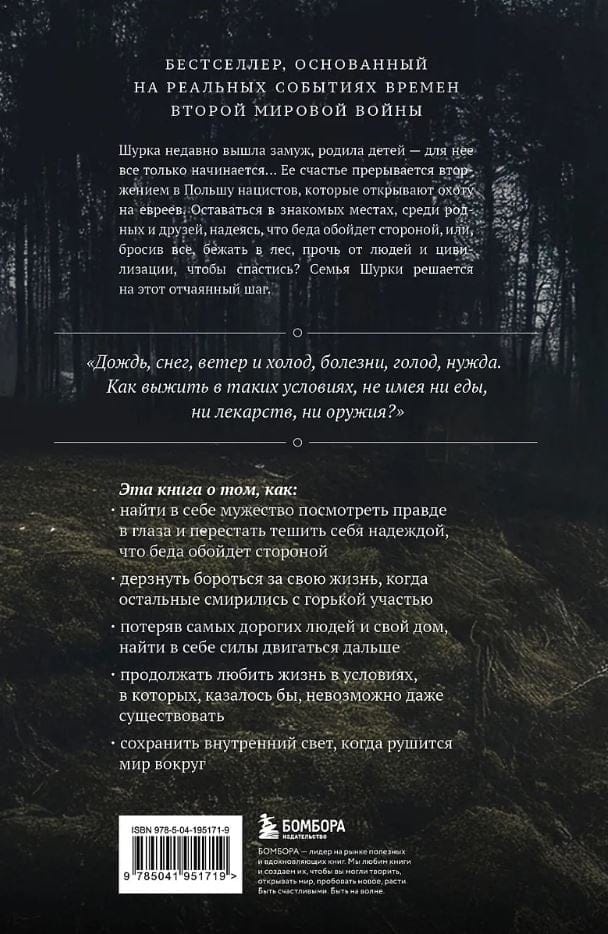 Женщина способна многое вынести и многое преодолеть. Счастье Шурки, вышедшей замуж за любимого человека и родившей дочку и сына, прерывают действия нацистов, вторгнувшихся в Польшу. Как и все евреи, семья Шурки в опасности. Оставаться в родных местах становится все более рискованно, и однажды ее муж принимает тяжелое решение: бросить все и бежать из гетто, куда их загнали нацисты, в лес, густой темный лес, который Шурка видела в детстве на горизонте и которого смертельно боялась, где не будет ни еды, ни жилья, ни лекарств для ее маленького слабого сына.