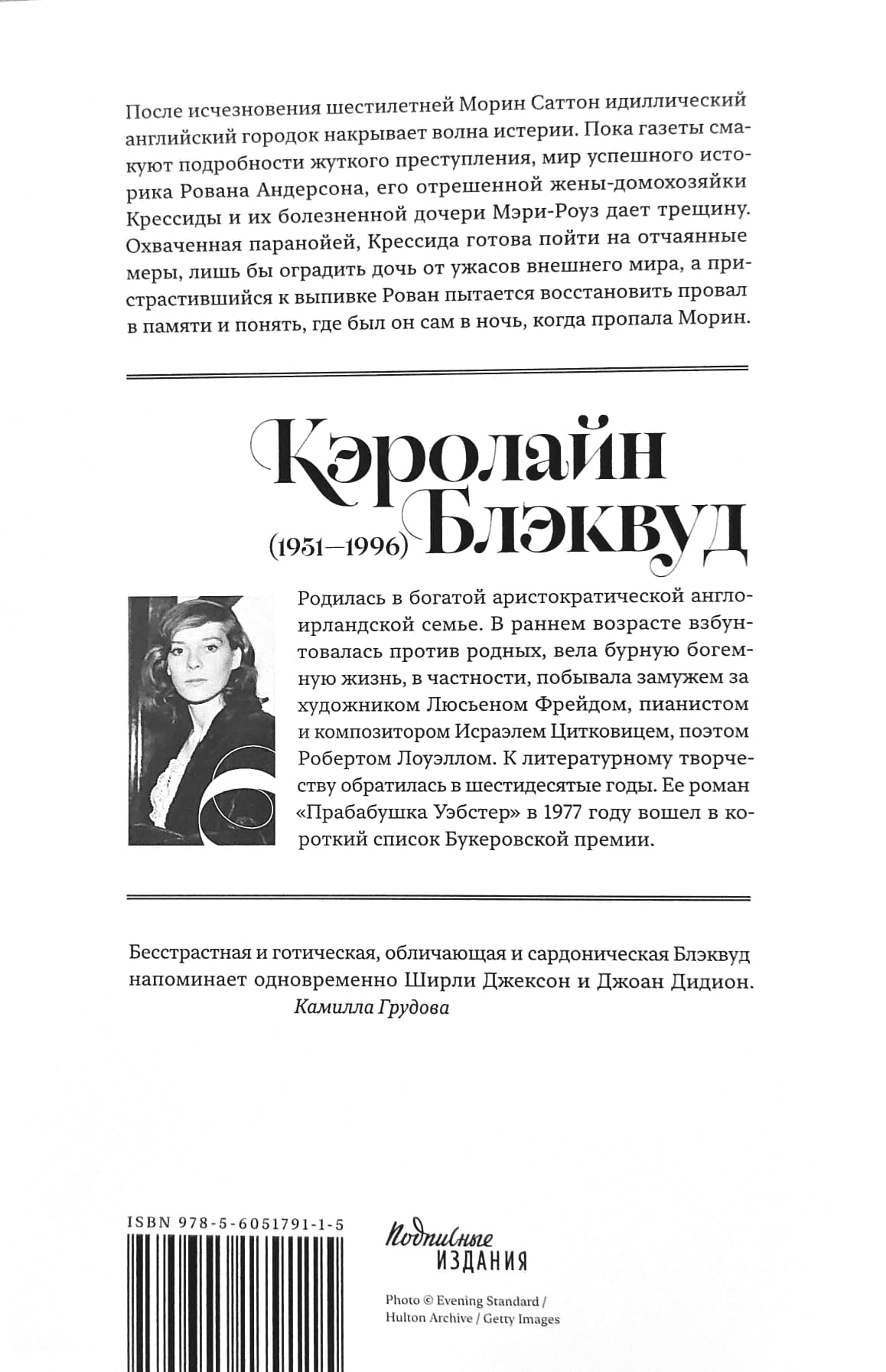 Кэролайн Блэквуд (1931–1996) родилась в богатой аристократической англо-ирландской семье. В раннем возрасте взбунтовалась против родных, вела бурную богемную жизнь, в частности, побывала замужем за художником Люсьеном Фрейдом, пианистом и композитором Иcраэлем Цитковицем, поэтом Робертом Лоуэллом. К литературному творчеству обратилась в шестидесятые годы. Ее роман «Прабабушка Уэбстер» в 1977 году вошел в короткий список Букеровской премии.