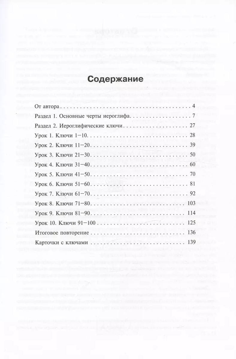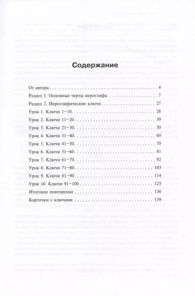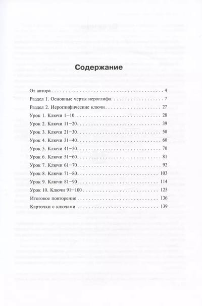 Тема второго раздела — изучение ключей. В каждом из 10 уроков пособия изучается группа, состоящая из 10 ключей. Ключи в пособии расположены в порядке возрастания количества черт в соответствии со сводной таблицей словаря «Канси». К каждому ключу подобрано по пять примеров иероглифов. После изучения каждой группы из 10 ключей даются упражнения для повторения.