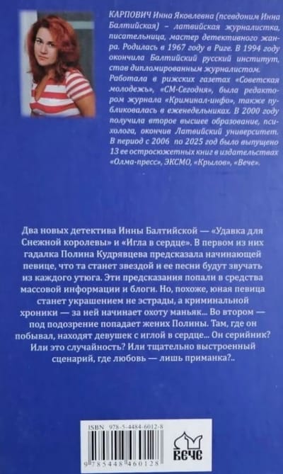 Два новых детектива Инны Балтийской — «Удавка для Снежной королевы» и «Игла в сердце». В первом из них гадалка Полина Кудрявцева предсказала начинающей певице, что та станет звездой и ее песни будут звучать из каждого утюга. Эти предсказания попали в средства массовой информации и блоги. Но, похоже, юная певица станет украшением не эстрады, а криминальной хроники — за ней начинает охоту маньяк... Во втором — под подозрение попадает жених Полины. Там, где он побывал, находят девушек с иглой в сердце... Он серийник? Или это случайность? Или тщательно выстроенный сценарий, где любовь — лишь приманка?